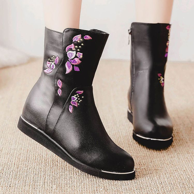 Cotton boots, winter velvet boots, short boots, embroidered shoes, flat bottomed low heeled women's boots, casual