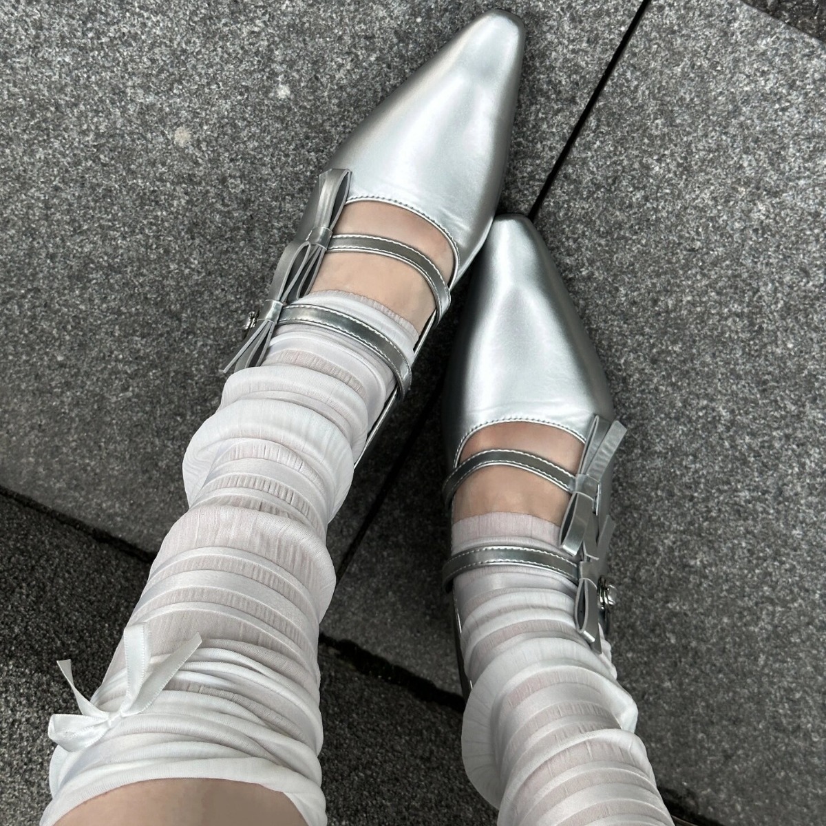 【】Silver High-End Pointed Toe High Heel Single Shoes for Women, Chunky Heel French Mary Jane Spring Summer New Leather Shoes