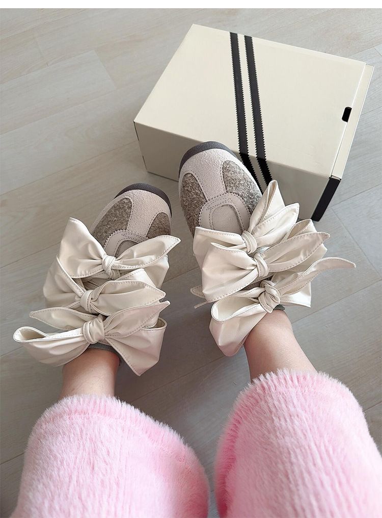 Cowhide Version~ Big Bow Color Block Round Toe Genuine Leather German Training Shoes Women's Sports Casual Shoes Women's Thick Sole Forrest Gump Shoes