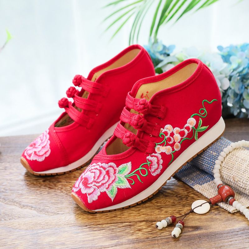 Scarpe sportive da donna in tessuto turistico, fibbia con fiore di peonia, scarpe ricamate in stile etnico
