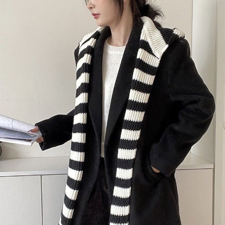 Autumn Winter New Striped Hooded Shawl for Women, High-end Knitted Wool Fashion Versatile Neck Warmer, Winter Scarf