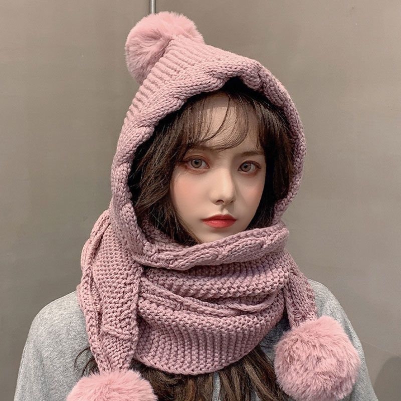 Cappello di lana in stile coreano per le donne autunno e inverno, tutto abbinato con sciarpa integrata, cappello carino con palla di pelo, protezione per le orecchie, cappello lavorato a maglia spesso e caldo