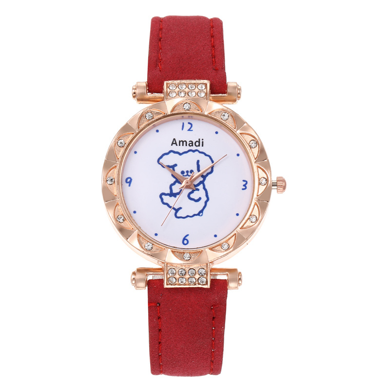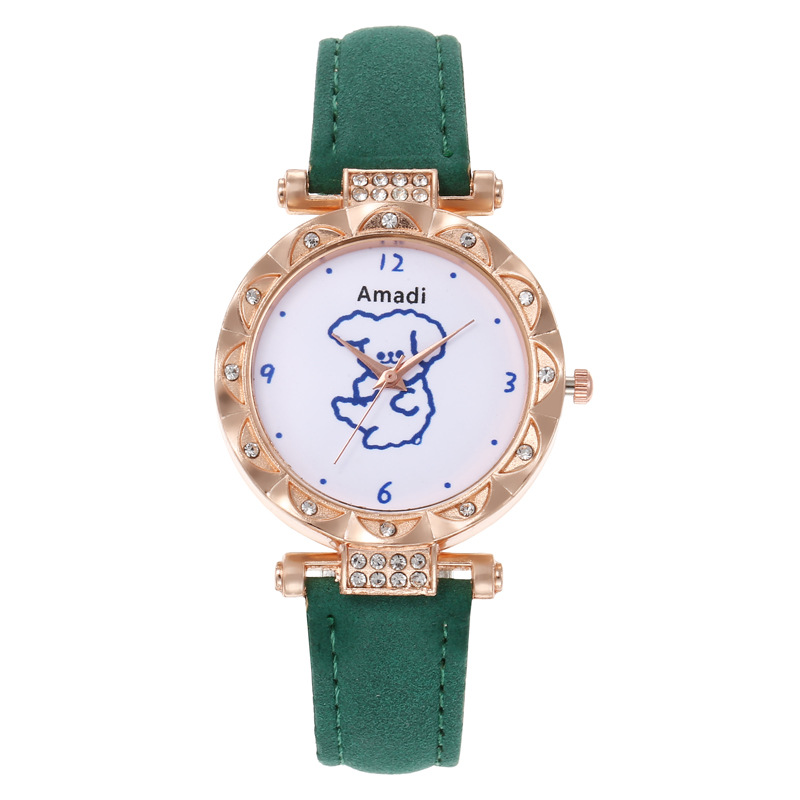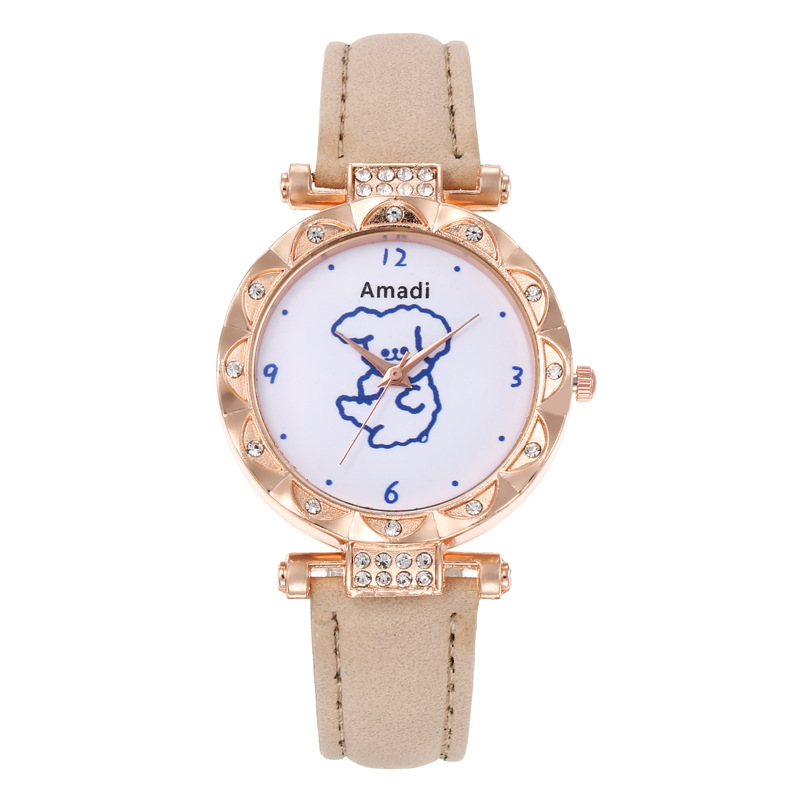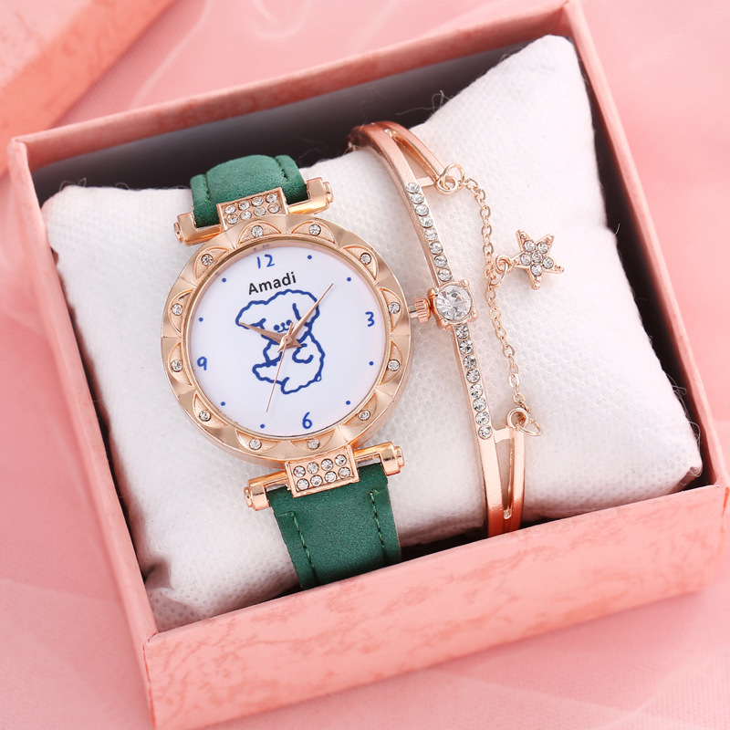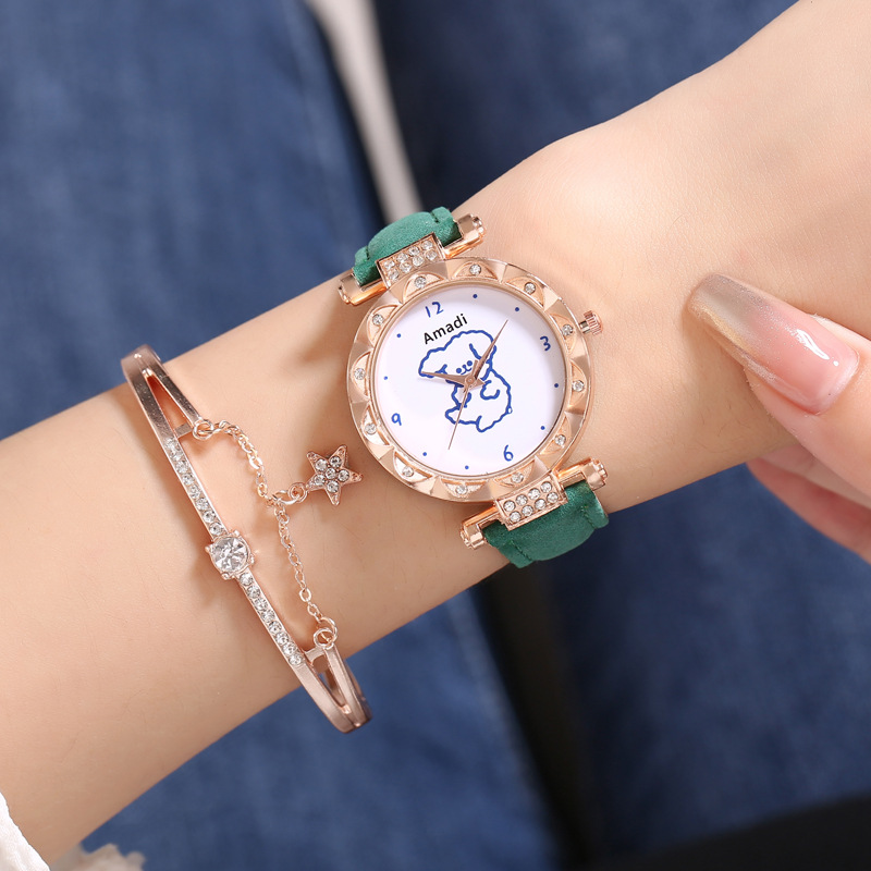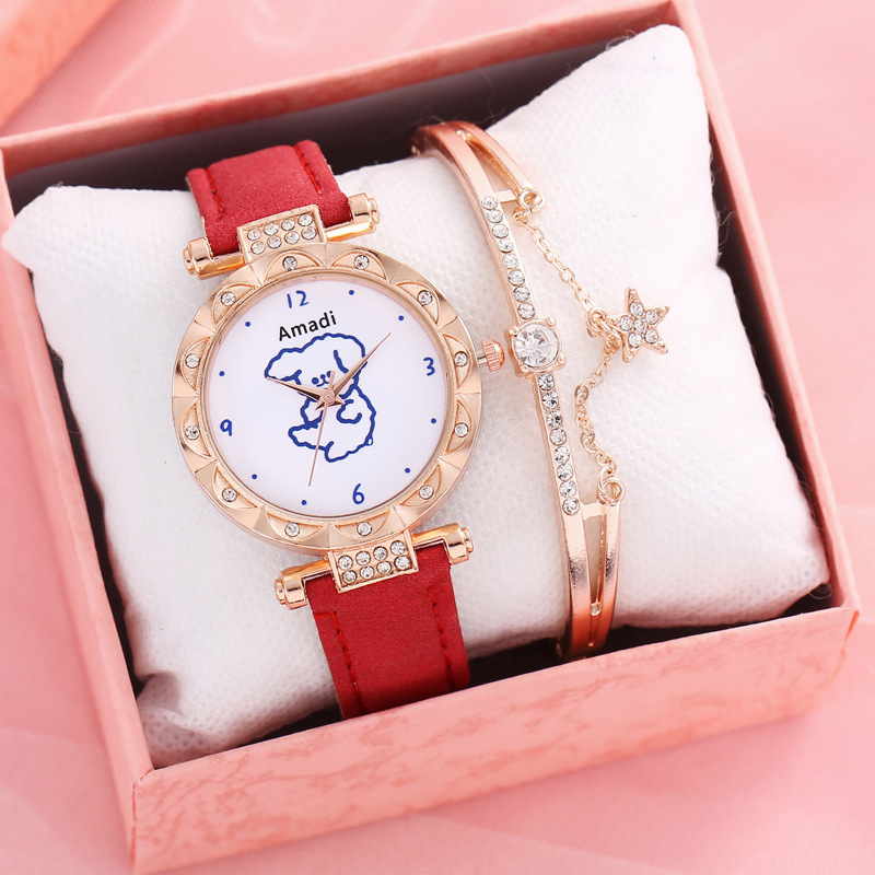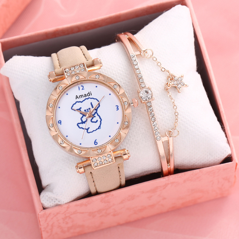 Orologio selezionato 2024 minimalista e carino piccolo orso, set di due pezzi di bracciali a stella per orologi da donna, pelle smerigliata per orologi al quarzo da donna