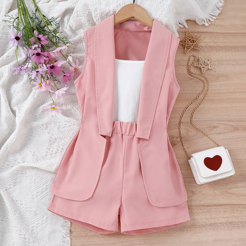 Set da bambina estivo di medie dimensioni con canotta in cotone sospesa, pantaloncini tinta unita, senza maniche, cappotto lungo