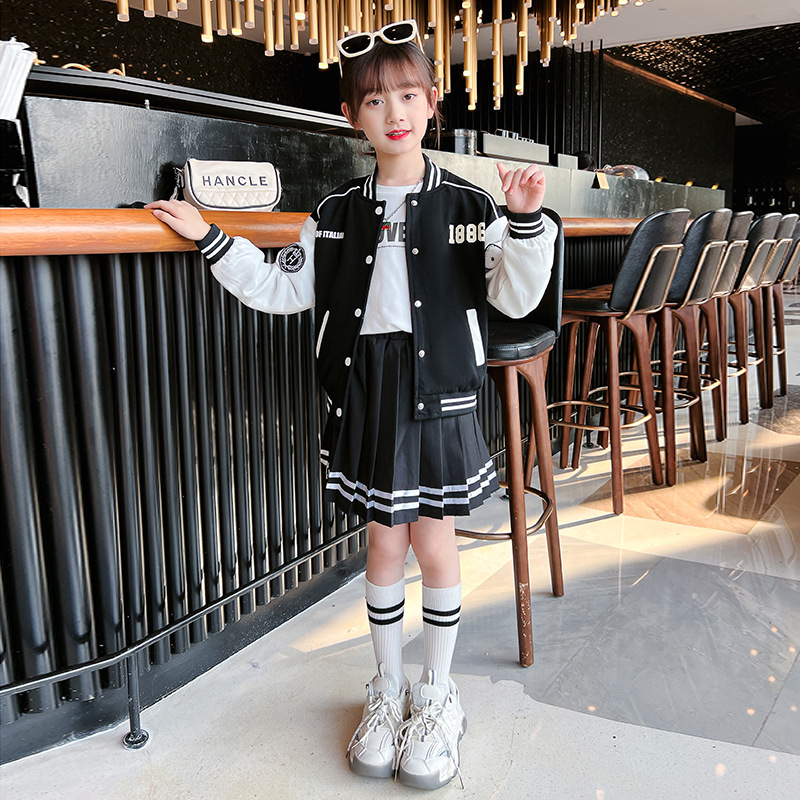 Girls' Set New Spring and Autumn Children's Baseball Suit Casual Sports Two Piece JK Uniform Fashionable Pleated Skirt