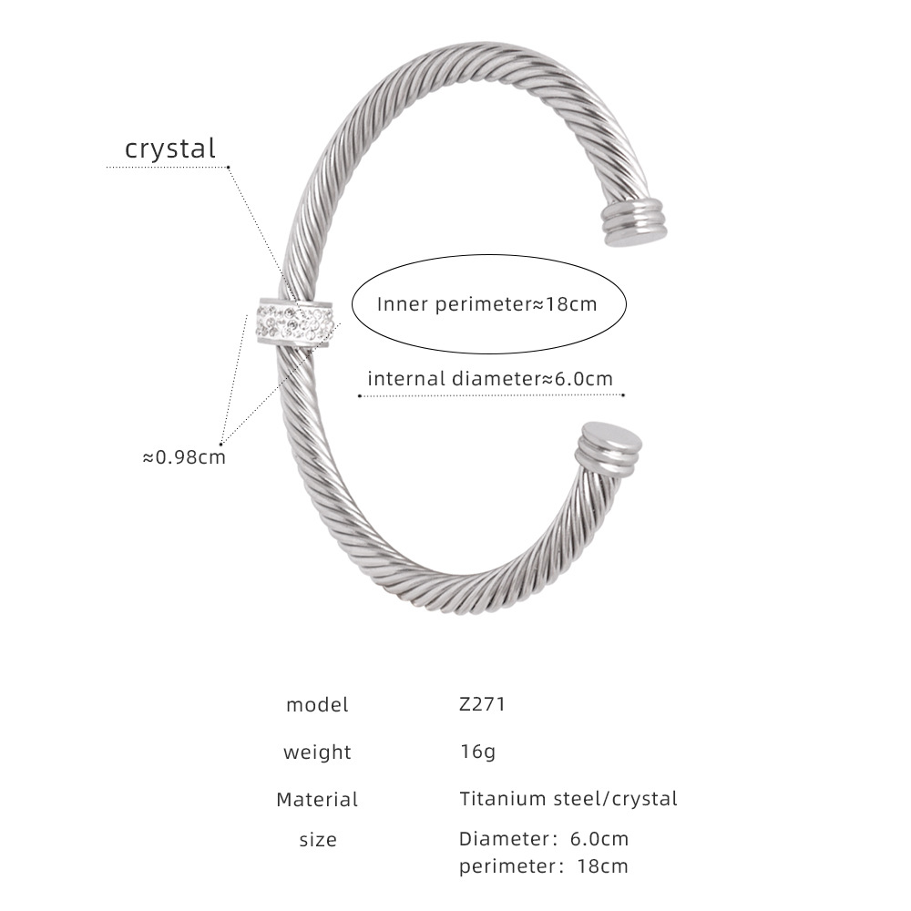 Twisted Cable Design Collection: Features a set of stackable bracelets with twisted cable detailing, available in gold and silver tones, some adorned with sparkling crystal accents. This design embodies bold, modern elegance, perfect for creating layered, statement-making looks.
