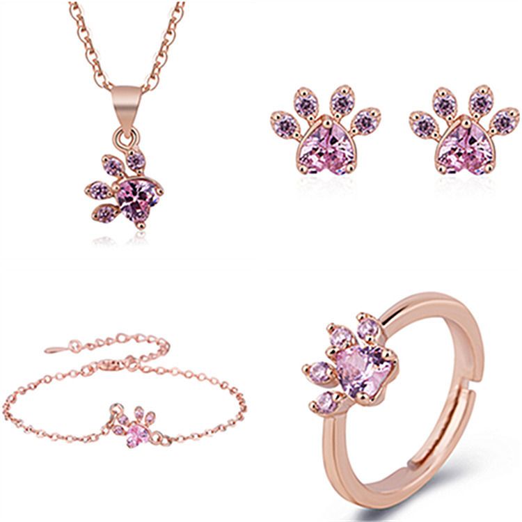Set di collana, orecchini, bracciale e anello con impronta a forma di cuore e zampa di gatto placcata in oro rosa