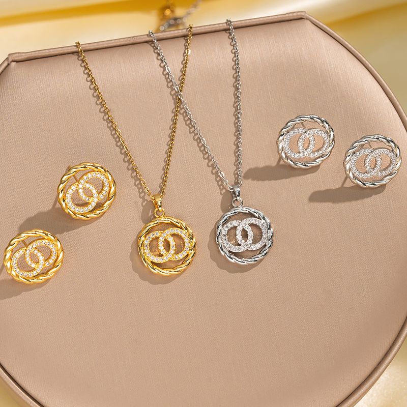 Korean Style Elegant High-End Double Ring Full Diamond Titanium Steel Necklace Earring Set Fashion Versatile Full Diamond Collarbone Chain Jewelry