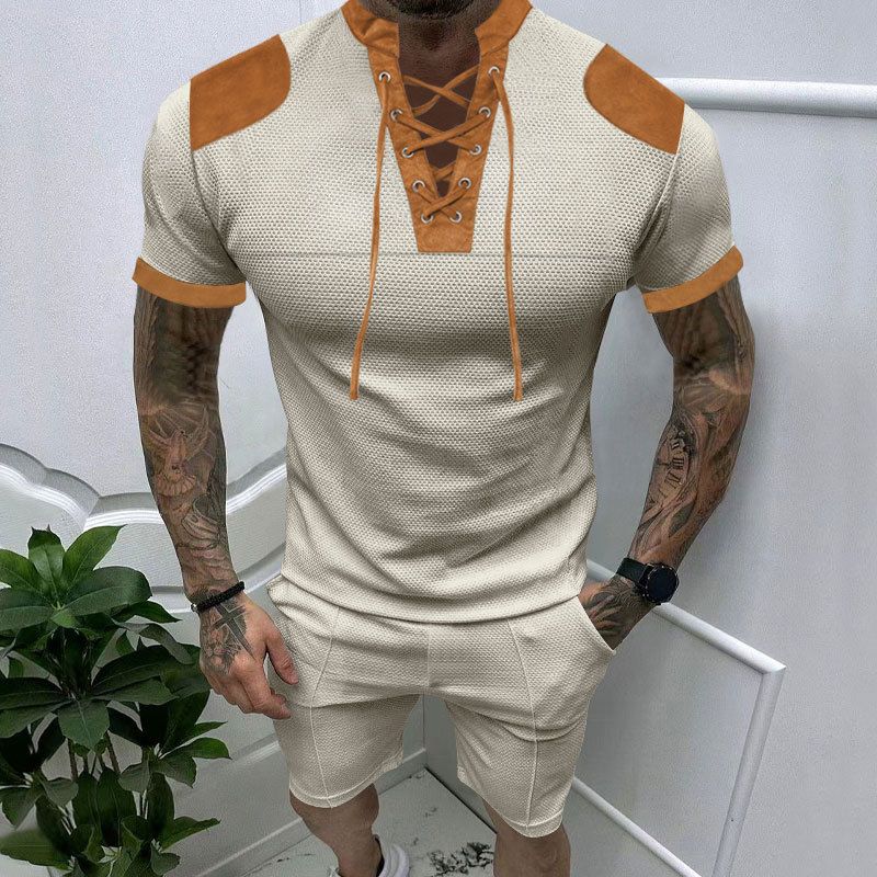 set di pantaloncini da t-shirt da uomo, set di abbinamenti di colori con camicia Henley estiva a maniche corte con scollo a V
