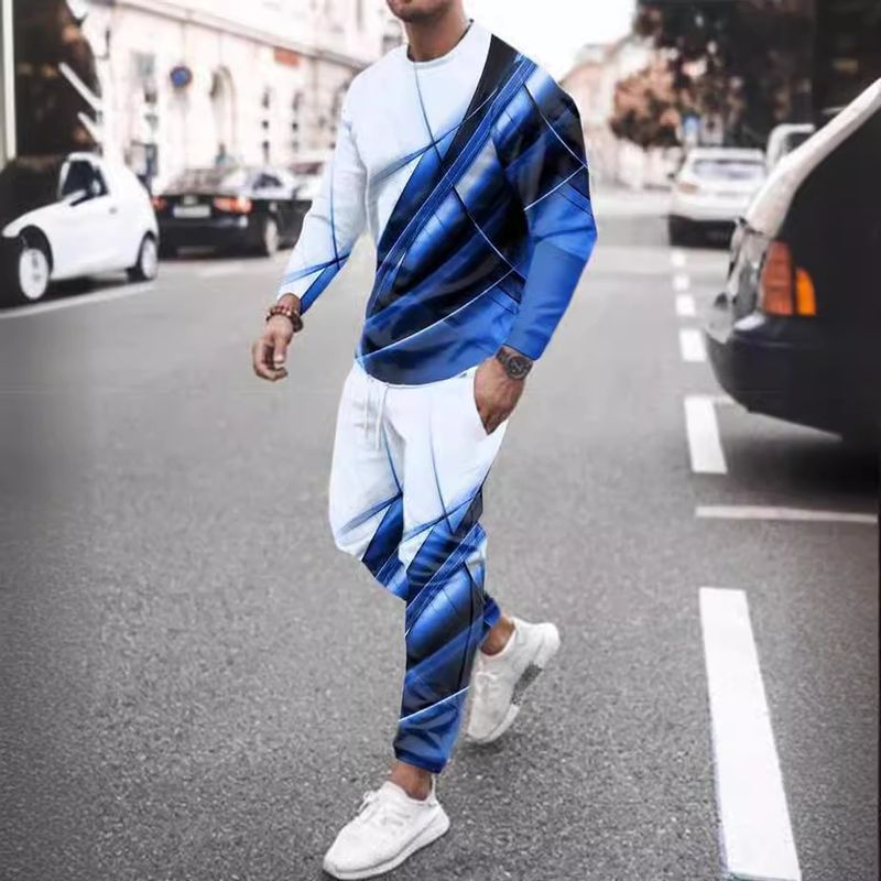 2021 autumn and winter European and American foreign trade new men's clothing 3D digital printing trend round neck long sleeve sweater trousers set