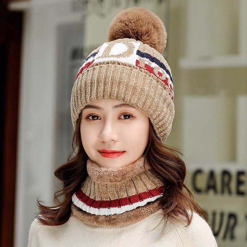 100% Cotton Fleece Winter Scarf Set Warm Knitted Sun Hat Outdoor Thickened Windproof Wool Hat with Wide Brim