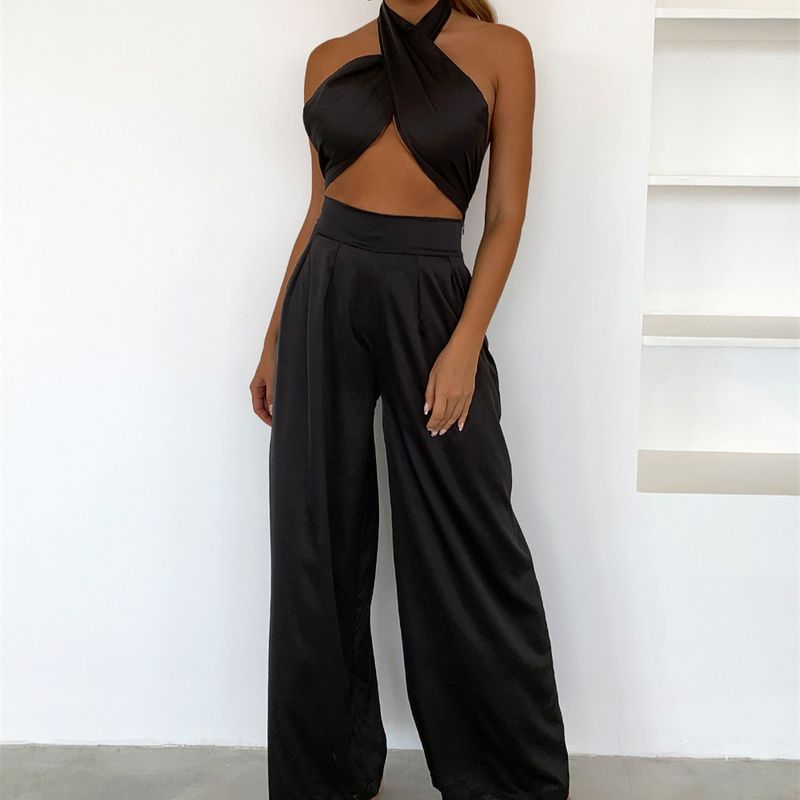 Sexy top con scollo all'americana incrociato e pantaloni lunghi per donna, set nero alla moda in due pezzi
