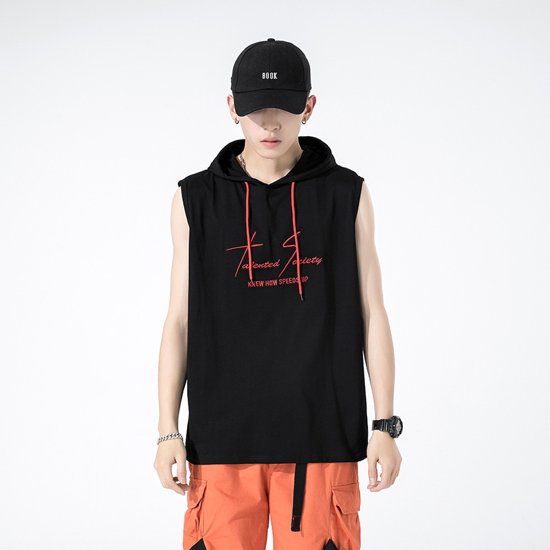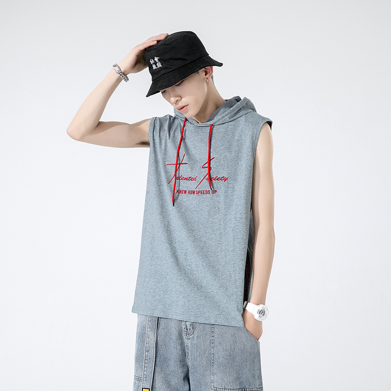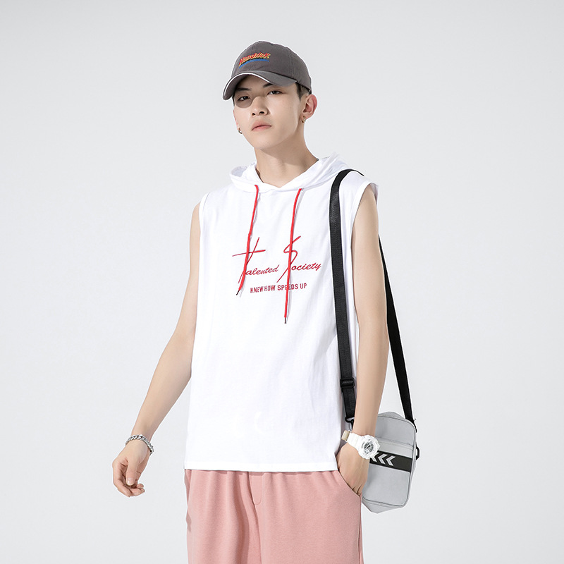 Canotta senza maniche da uomo estiva nuova, versione coreana ampia, maglietta in puro cotone, maglietta sportiva con cappuccio, da corsa e