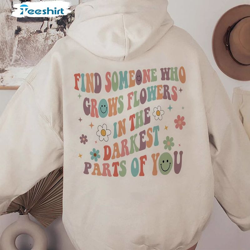 Slogan: Trova qualcuno che pianti fiori nel tuo posto più oscuro. Maglietta colorata con cappuccio e giacca.