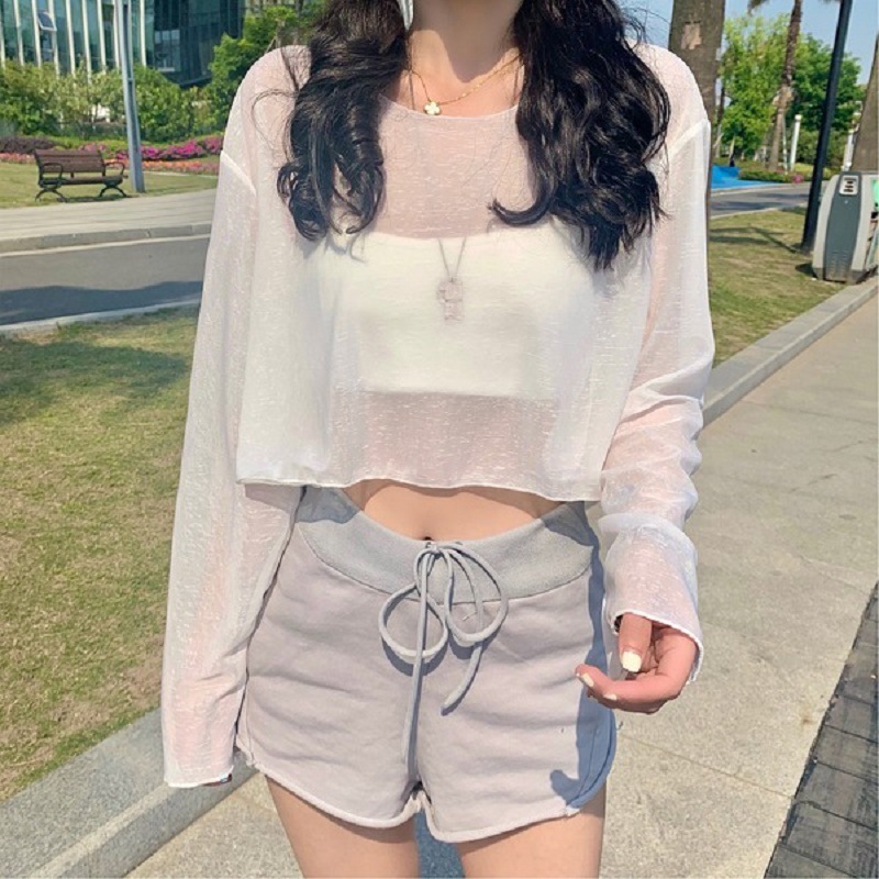 Solid color transparent sunscreen clothes, women's loose long sleeved T-shirts, women's couples wear base shirts, short and cute women's fashion Instagram