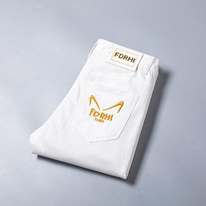 Spring/Summer Thin Men's Trendy Brand Jeans High end Brand Embroidered Casual Slim Fit White Cotton Elastic Feet Pants