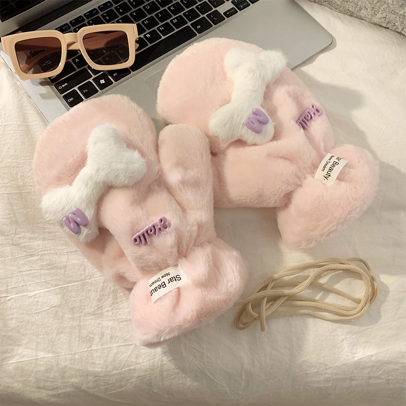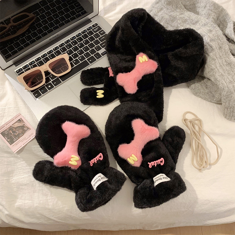 Korean Style Cute Warm Plush Thickened Gloves Winter Skiing Cycling Windproof Cold-Proof Cartoon Neck Hanging Five-Finger Gloves