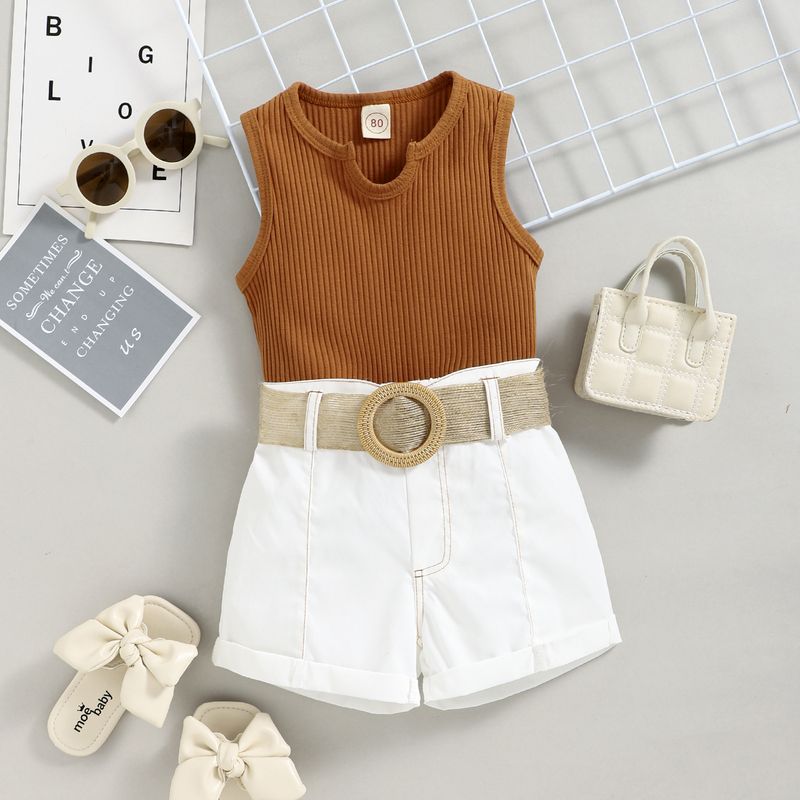 Stile di abbigliamento per bambini TX, top estivo senza maniche a righe, pantaloncini bianchi con bordo arrotolato, completo da ragazza