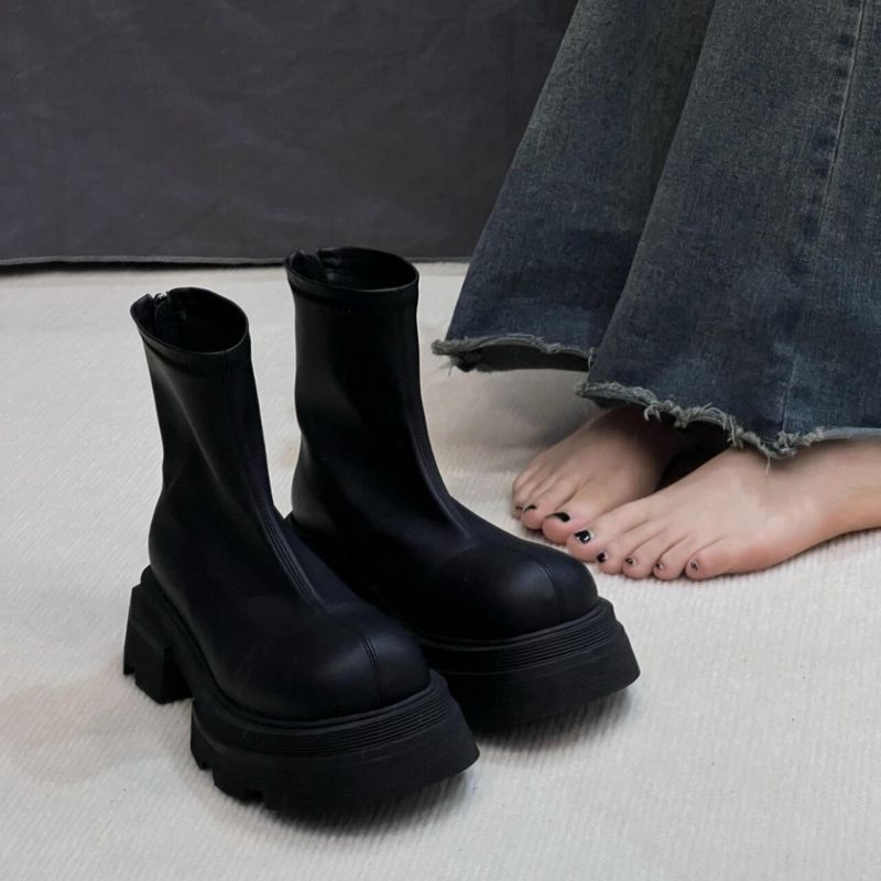 Stivali bassi con plateau da donna, autunno inverno 2025, nuovi, casual, versatili, elasticizzati, sottili, con tacco grosso e alluce, altezza crescente