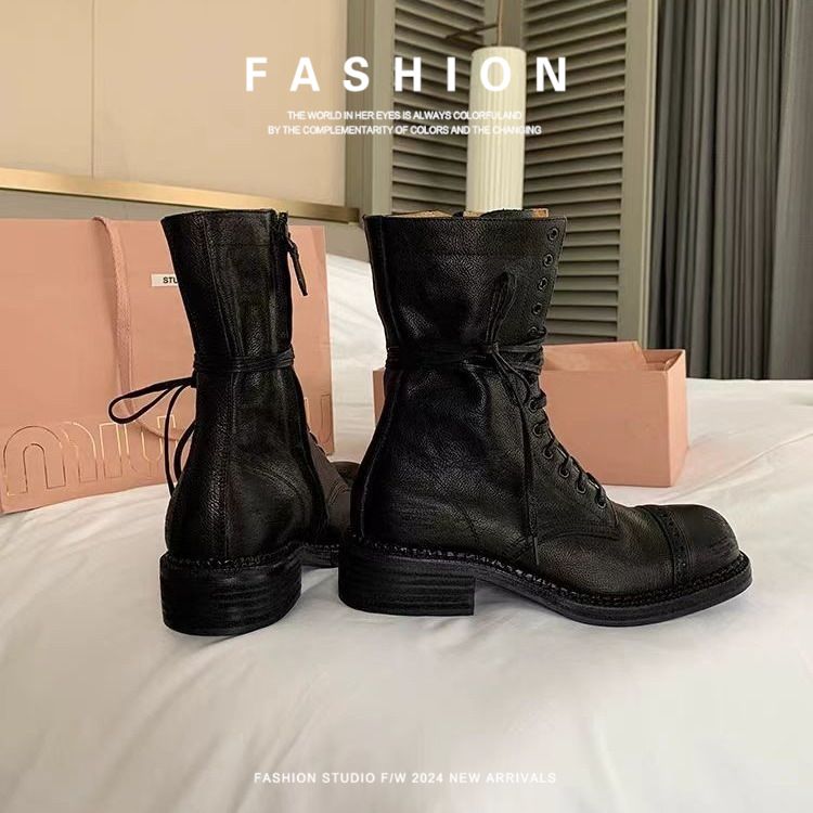 Genuine Leather Grape Mom Carved Motorcycle Boots Round Toe Brogue British Style Martin Boots Side Zipper Short Boots for Women