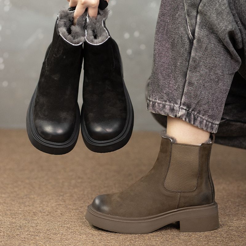 Stivali corti caldi e spessi in vera pelle foderati in pile per donna, nuovi stivali versatili in pelle scamosciata di vacchetta