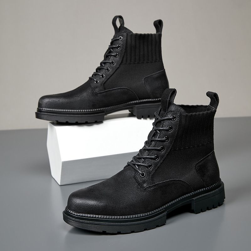 Trendy Martin Boots British Style Thick Sole High Top Men's Work Lace-up Boots Elastic Genuine Leather Outdoor Hiking Boots