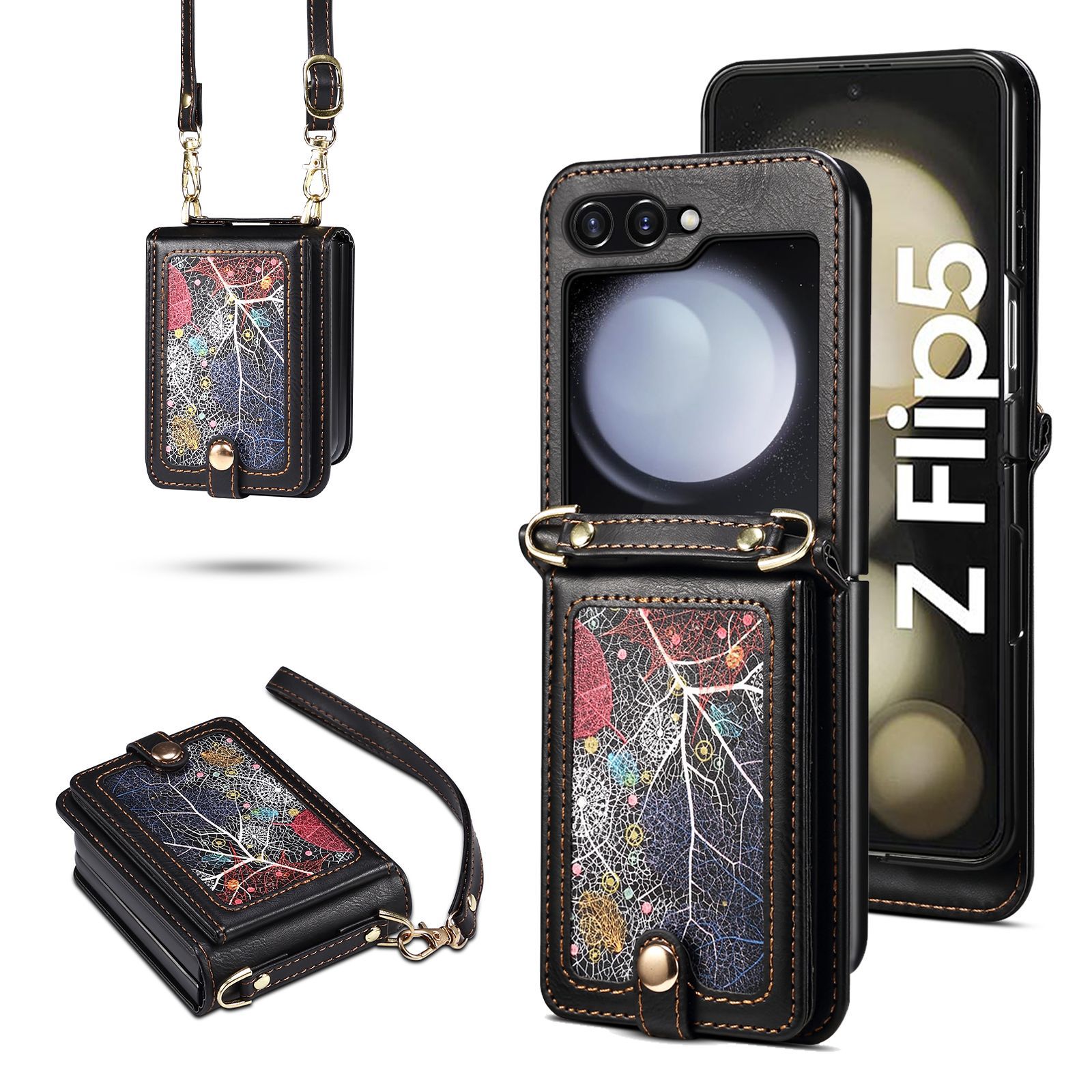 Suitable for Samsung ZFLIP5 Vast Interstellar Leather Pattern Card Insert Case zflip4 Diagonal Strap Folding Phone Case