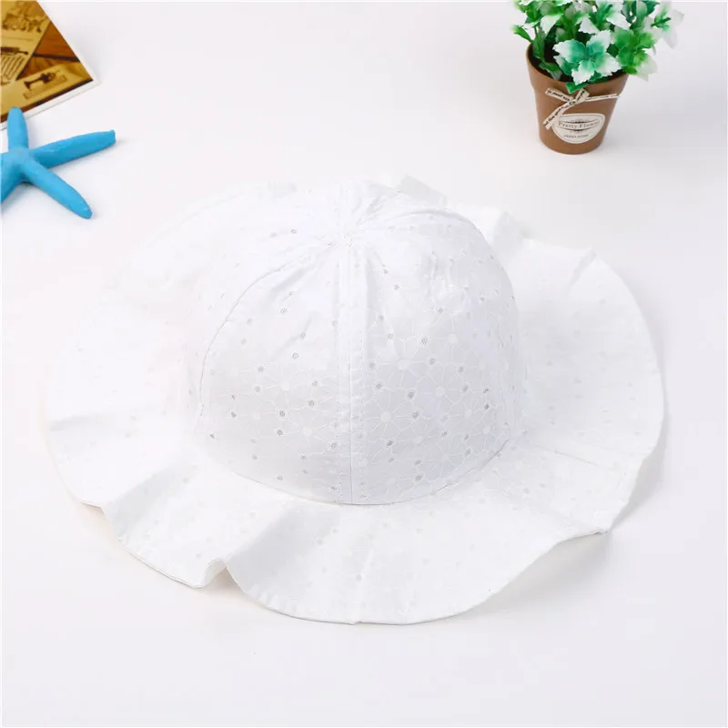 Cappello da pescatore da spiaggia da viaggio per bambini a tesa larga in tinta unita con volant floreale per bambina estiva