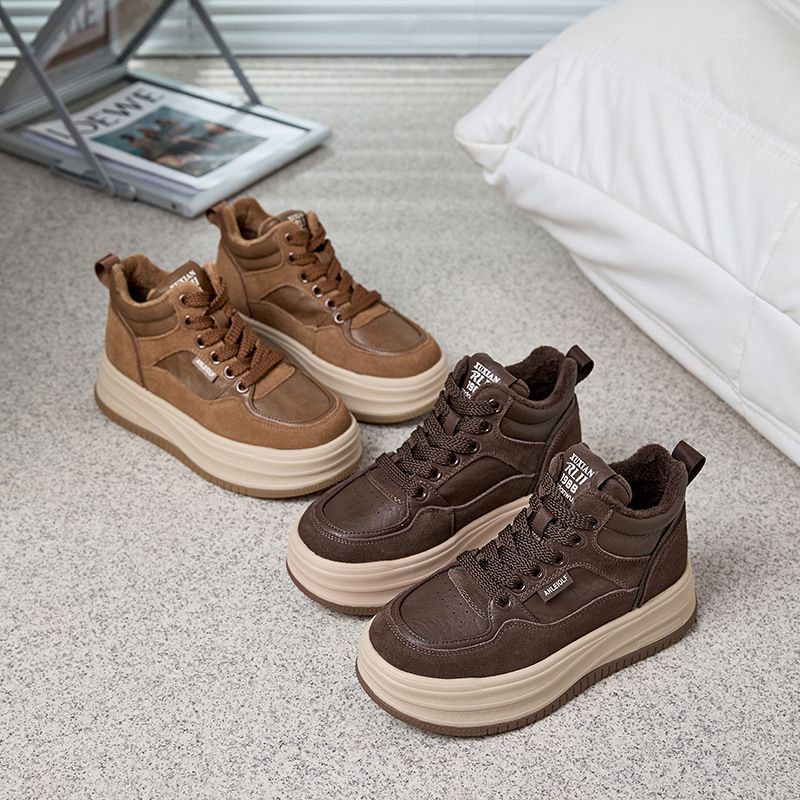 Board shoes women's thick sole 6cm high top genuine leather 2024 autumn new item sponge cake slimming and comfortable plus velvet women's shoes