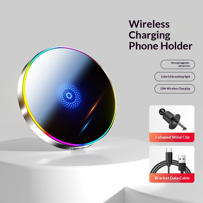 Cross-Border New Seven-Color Iridescent Ambient Light Car Wireless Charger Navigation MagSafe Strong Magnetic Phone Holder