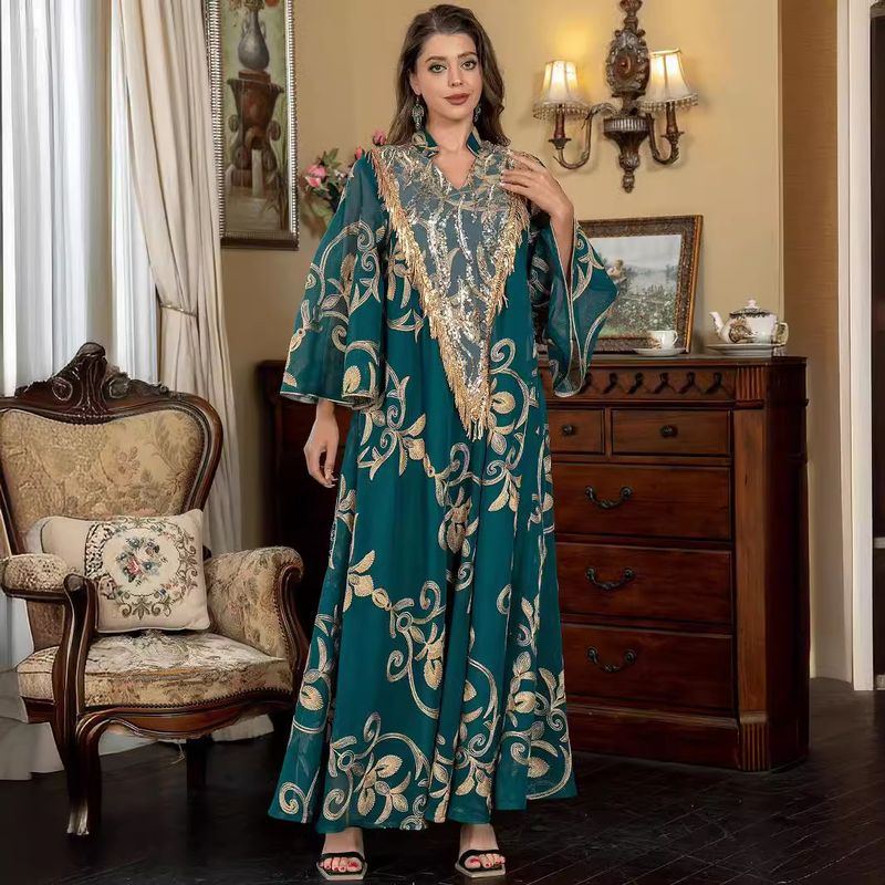 SW009 Abito lungo alla moda con scollo a V e paillettes ricamate da donna musulmana araba Abaya