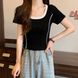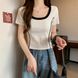 Shoulder short sleeved T-shirt for women in summer, unique and chic color blocking, square neck shirt with contrasting colors, waist cinched fishbone short top, trendy