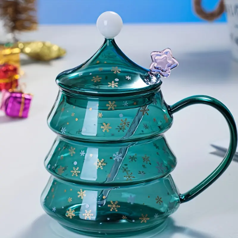 Tazza di Natale, tazza di vetro a forma di albero di Natale, tazza di vetro resistente al calore, tazza dei desideri a forma di stella di Natale a doppia parete isolata con coperchio