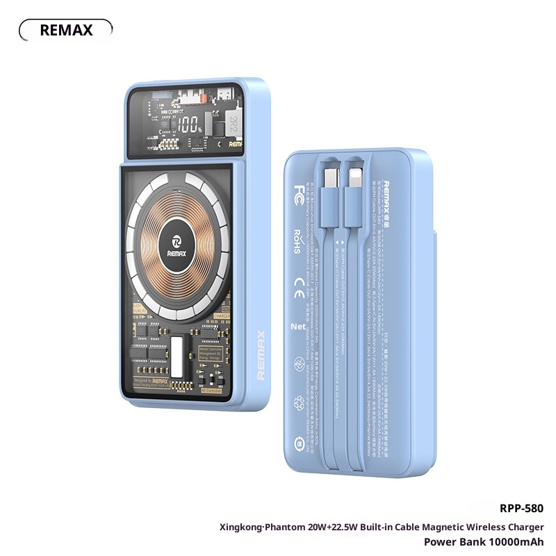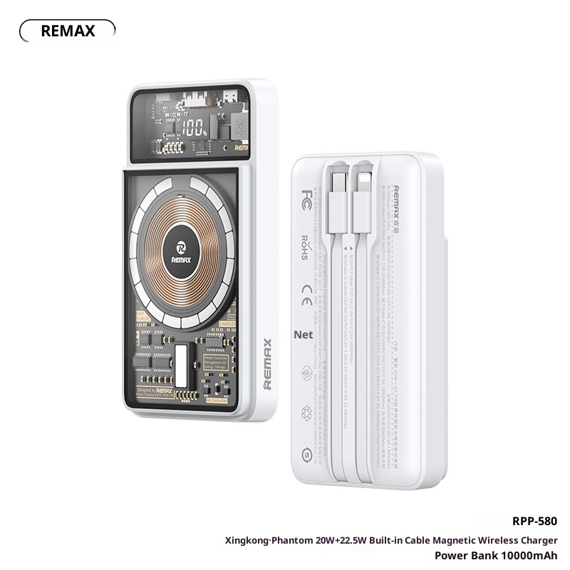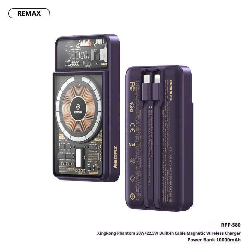 Brand:Remax/Rui Liang,Classification:Power Bank,Item Number:RPP-580,What type of battery?:Li-polymer Battery,Battery Cell Type:Polymer lithium-ion battery cell,Case material:PVC,Color:RPP-580-Mousse White, RPP-580-Dark Night Black, RPP-580-Distant Peak Blue, RPP-580-Dark Purple,Power Capacity:10000mAh,Size:120.1*66.7*19.6mm,We have authorized private labels available:yes,Is it exclusively for cross-border export supply?:yes,Is it a patented source product?:No,Charging power:22.5W,Style:creative design,Manufacturer:Shenzhen Ruihe Technology Co., Ltd,Rated Capacity:5000mAh5V-3A,Input Voltage:5V/9V/12V,Battery capacity:10000,Maximum Output Power:22.5W,Voltage:5V/9V/12V,3C Certificate Number:2024260914000601,Charging Protocol:PD2.0,Functionality:Compact and portable, magnetic charging, wireless charging, multi-voltage, comes with data cable, supports fast charging, battery level display,Is it only for cross-border?:No,Is it exclusively for foreign trade?:No,Model Number:RPP-580