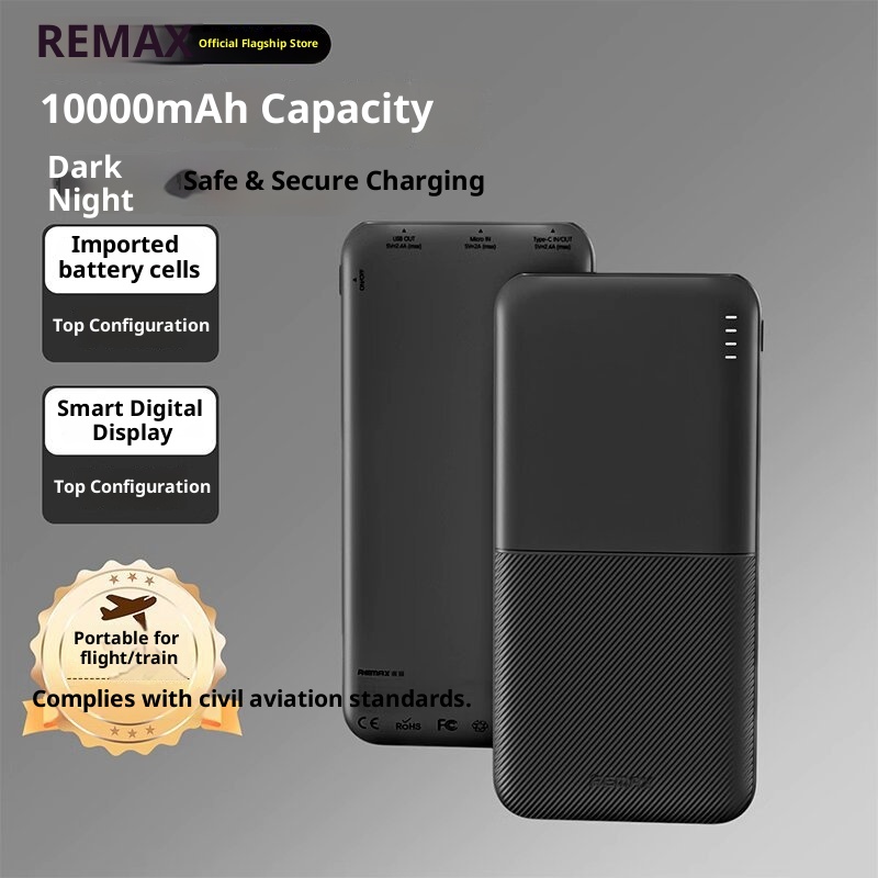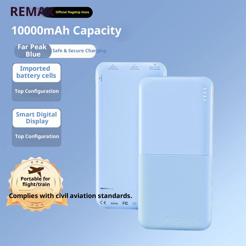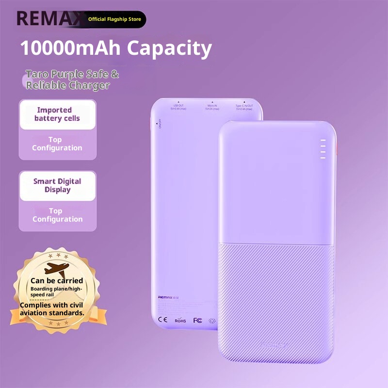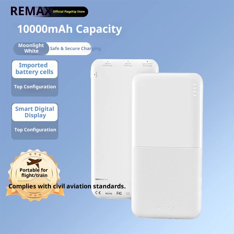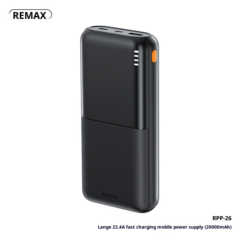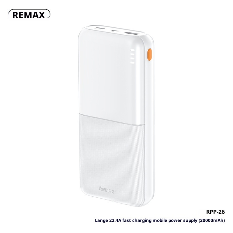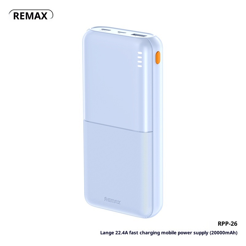 Brand:Remax/Rui Liang,Classification:Power Bank,Item Number:RPP-23/RPP-26,What type of battery?:Li-polymer Battery,Battery Cell Type:Polymer lithium-ion battery cell,Case material:Plastic,Power Capacity:RPP-23--Dark Night Black-10000mAh, RPP-23--Moonlight White-10000mAh, RPP-23--Far Peak Blue-10000mAh, RPP-23--Taro Purple-10000mAh, RPP-26--Dark Night Black-20000mAh, RPP-26--Moonlight White-20000mAh, RPP-26--Far Peak Blue-20000mAh,Size:139.7*67.8*15.8mm,We have authorized private labels available:yes,Is it exclusively for cross-border export supply?:yes,Charging power:12W,Style:Industrial Style,Manufacturer:Shenzhen Ruihe Technology Co., Ltd,Rated Capacity:5500mAh5V-2A/11000mAh5V-2A,Input Voltage:5V,Battery capacity:20000,Maximum Output Power:12,Voltage:5V,3C Certificate Number:2024200914002845,Charging Protocol:PD3.0,Functionality:Compact and portable, with multiple USB output ports,Is it only for cross-border?:No,Is it exclusively for foreign trade?:No,Model Number:RPP-23/RPP-26