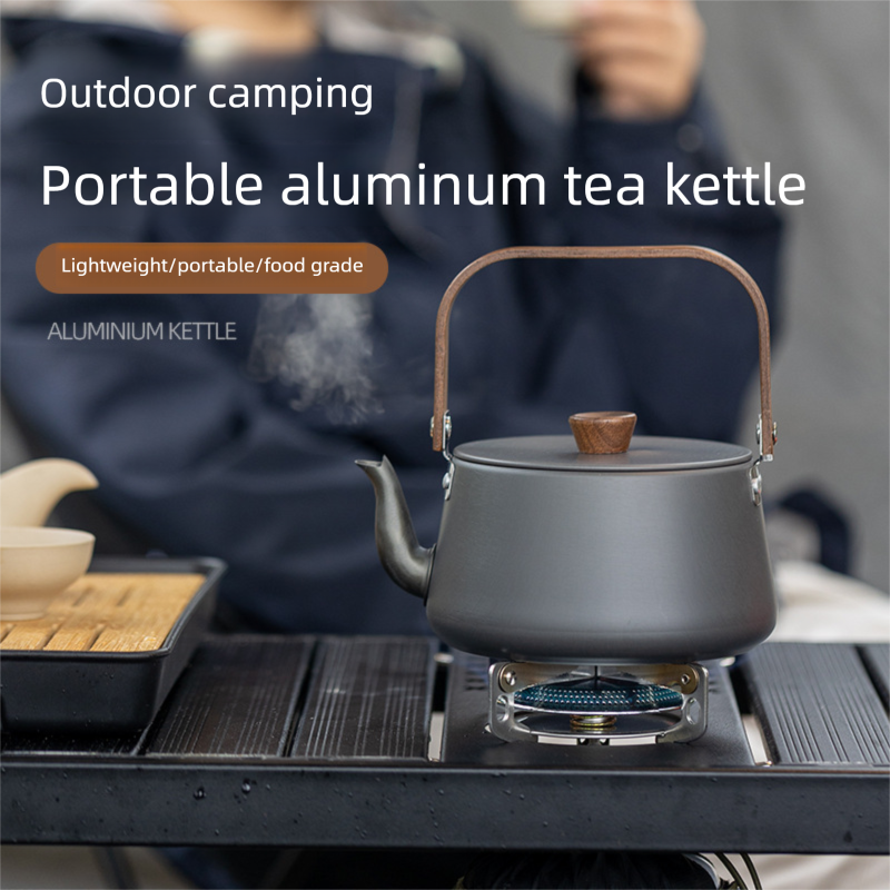 Teiera da esterno in lega di alluminio con manico in legno, bollitore per acqua bollente, tè, campeggio, picnic, caffettiera portatile