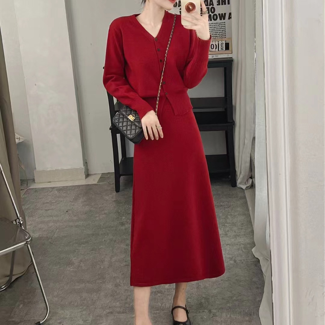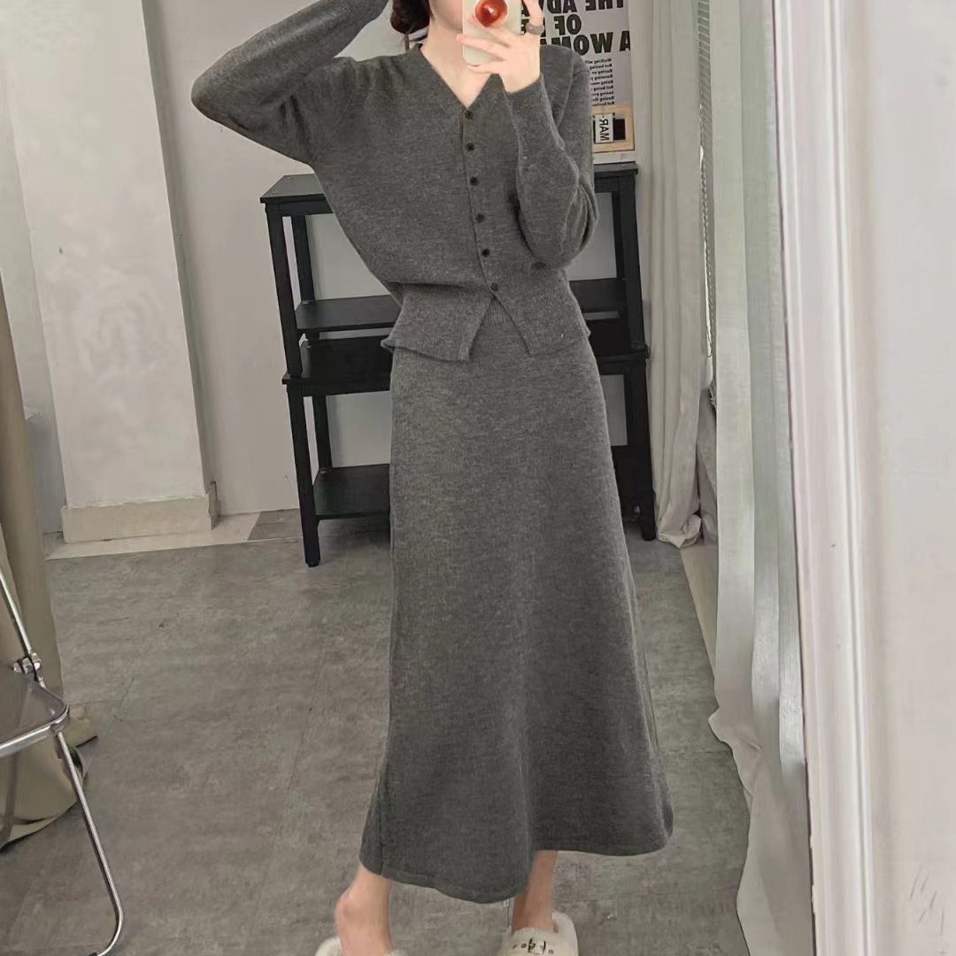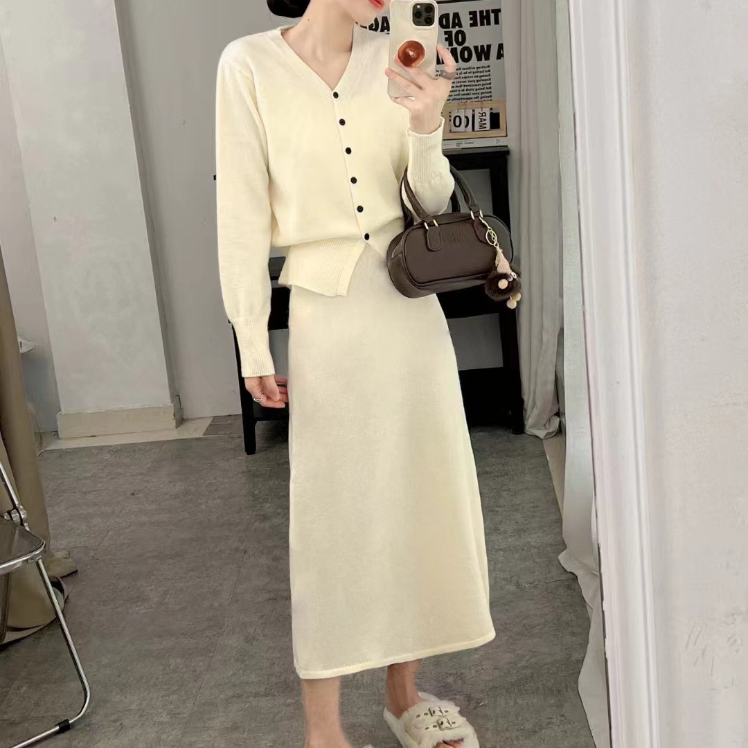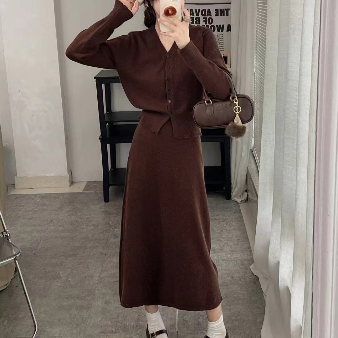 Temperament small fragrance style knitted two-piece set for women's spring and autumn V-neck knitted cardigan A-line half body long skirt sweater set for women