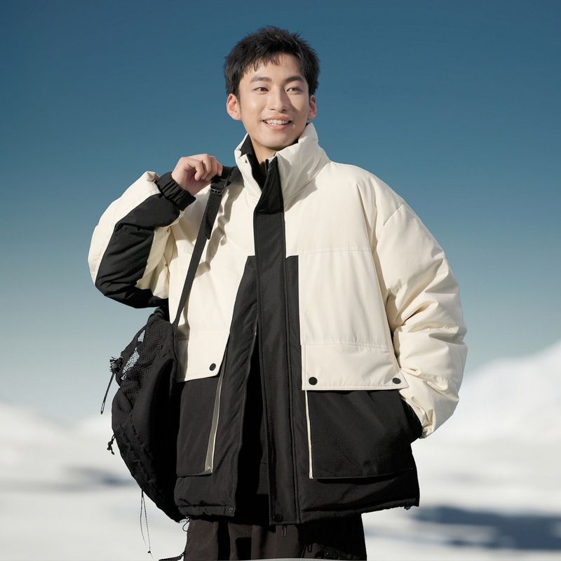Tendenza moda unisex, abbinamento di colori alla moda, versatile giacca in piumino d'anatra bianco, giacca calda casual da uomo per ragazzi