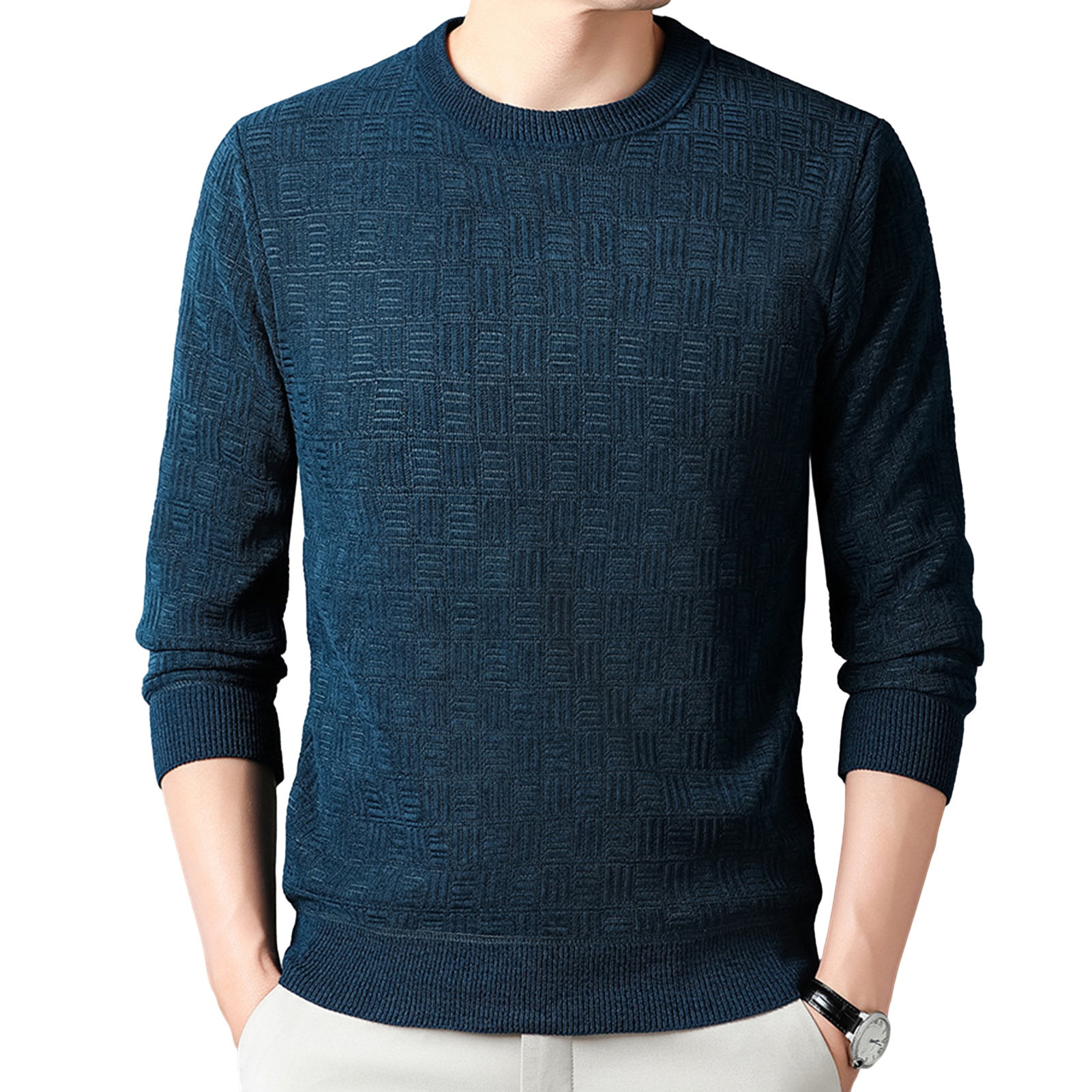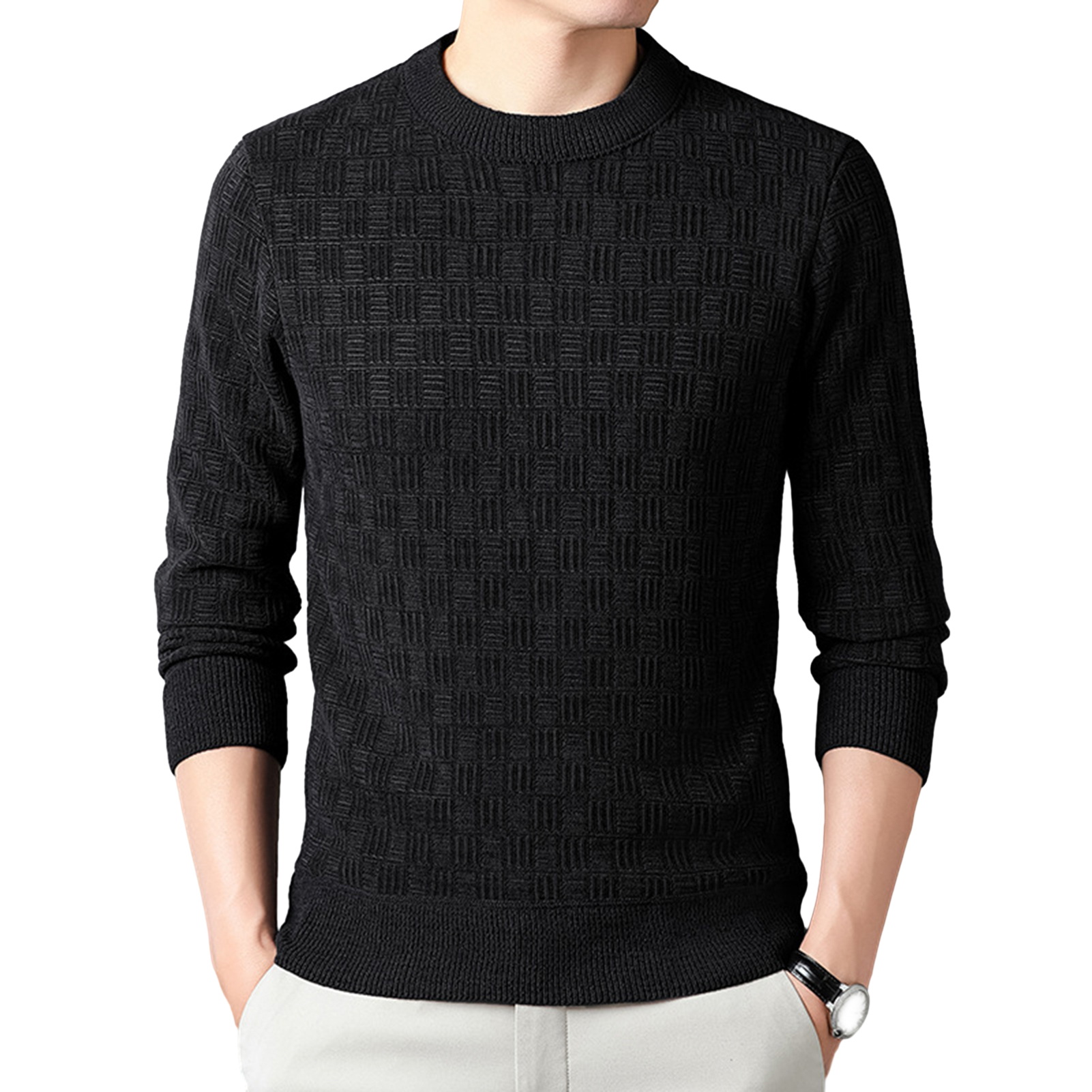 Our men's round neck sweater, a versatile addition to your wardrobe. Made from 100 polyester, this knitted long sleeve is lightweight and comfortable for all-day wear. Its solid color design makes it a great base layer that can be easily paired with trousers, casual pants, jeans, canvas shoes, sneakers, jackets, and more. The round neck, long sleeves, and pullover design ensure easy on and off. Whether you're heading to work, going out with friends, or going on a date, this sweater is a must-have for any ocn. Upgrade your style with our men's round neck sweater today