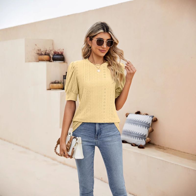 2025 Spring and Summer Button Hollow Bubble Sleeve Fashion Solid Color Short Sleeve Top