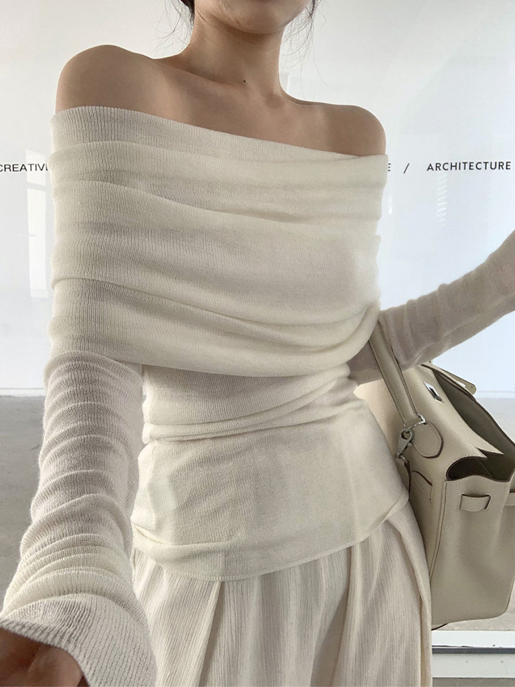 Top a maniche lunghe con spalle scoperte T-shirt a pieghe slim autunno da donna Maglione lavorato a maglia sottile casual moda femminile sexy728