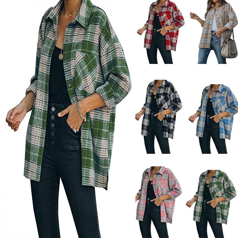 Top casual largo da donna 2024 nuova camicia a quadri in lana giacca da donna di media lunghezza