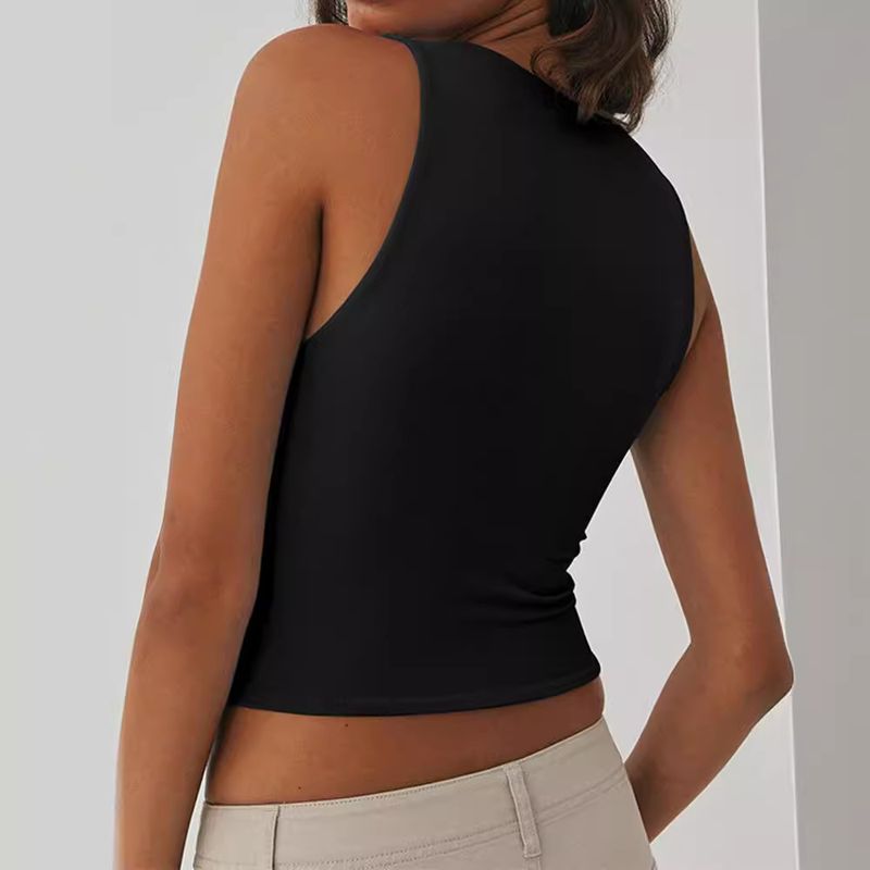 Top corto sexy da donna, senza maniche, aderente, con scollo rotondo e gilet a forma di croce, per uso esterno