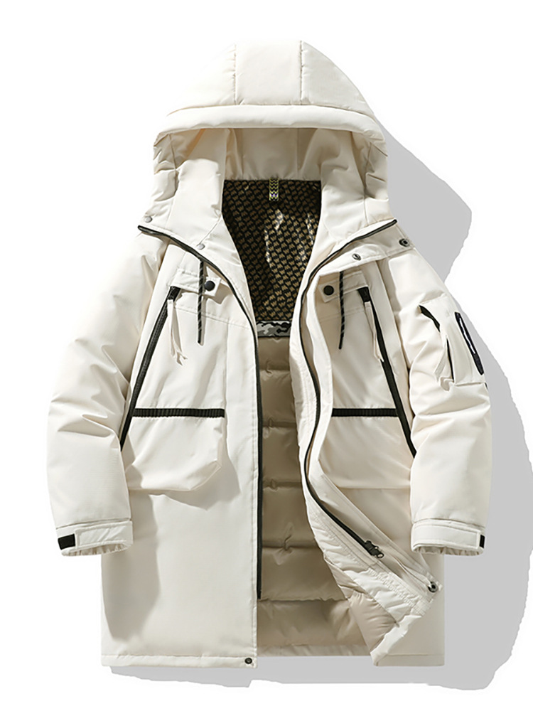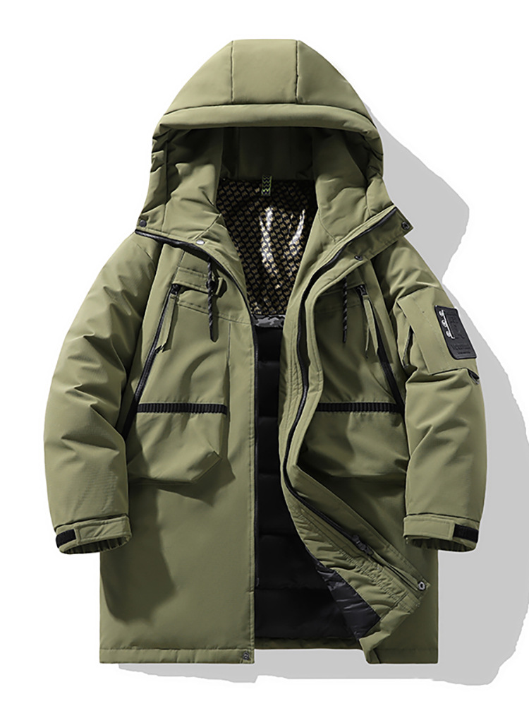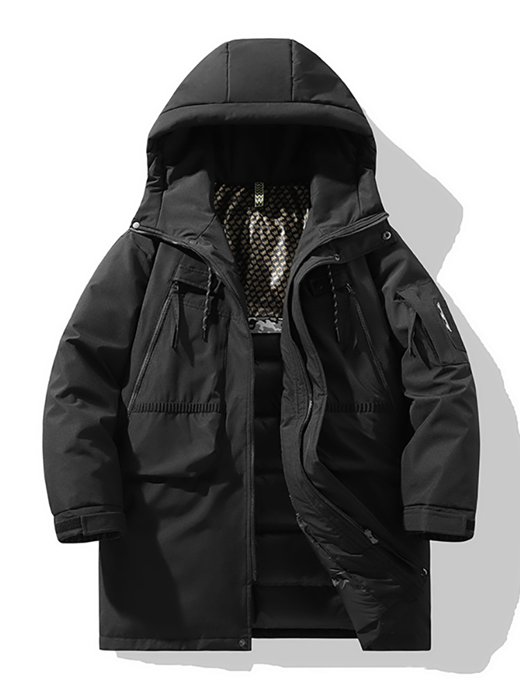 Giacca da uomo alla moda, da esterno, media, lunga, casual, con cappuccio, multi-borsa, da coppia, spesso
