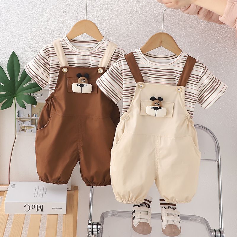 Children's Cartoon Striped Bag Cover Puppy Overalls Short Sleeve Set 2025 New Boys' Thin Two-Piece Summer Outfit