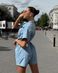 Tuta da donna in denim, estiva, a maniche corte, a vita alta, in stile retrò, elasticizzata, comoda, con gamba dritta.