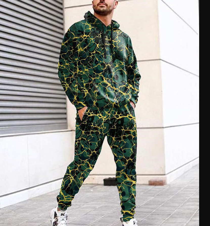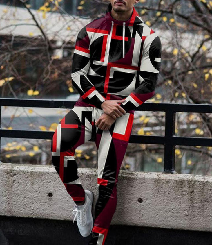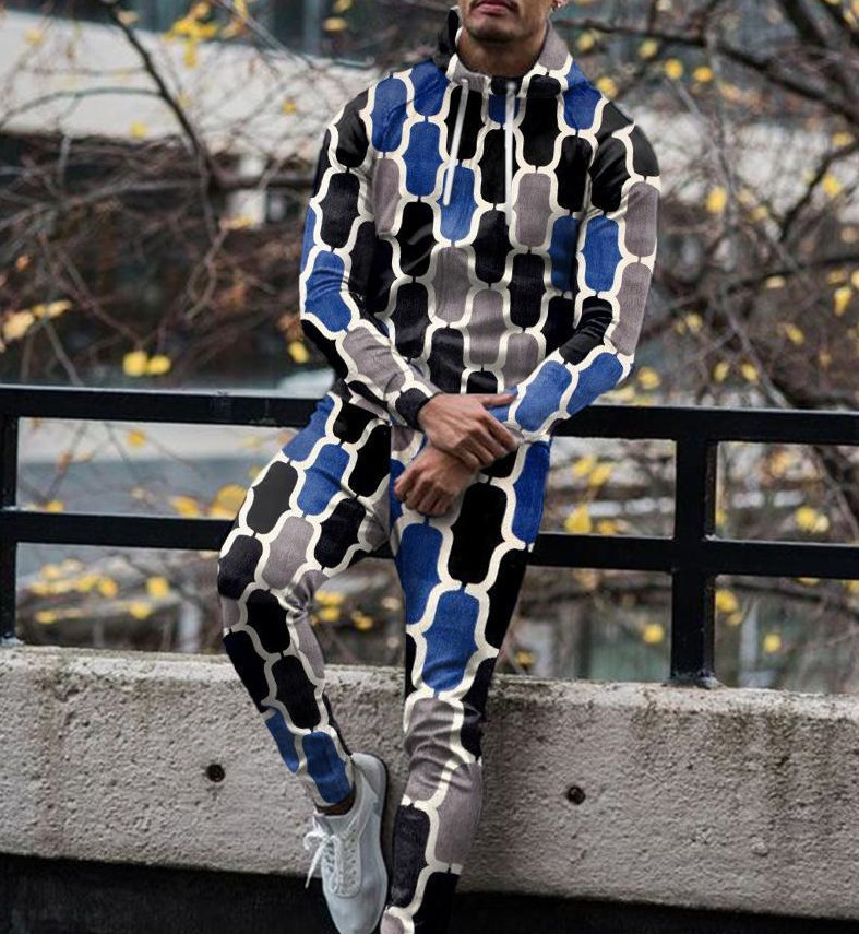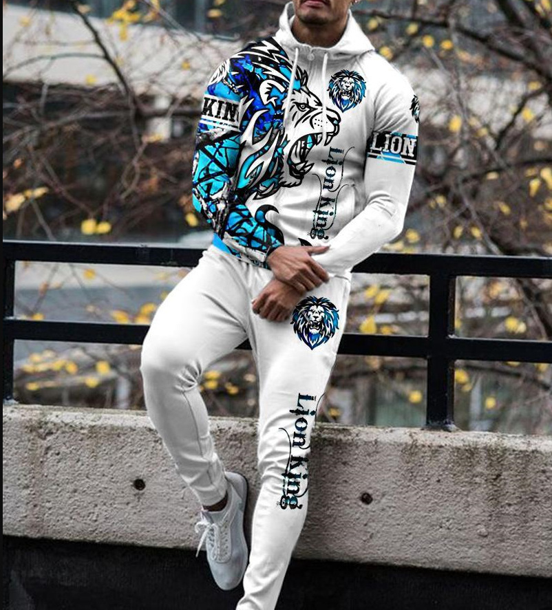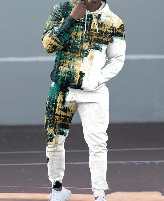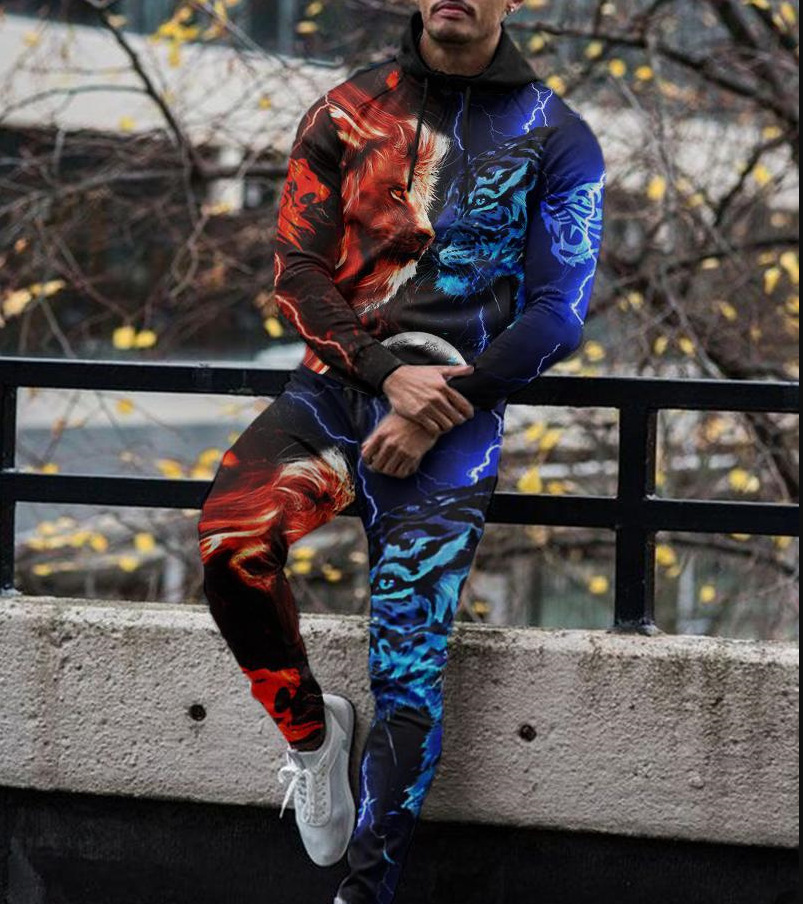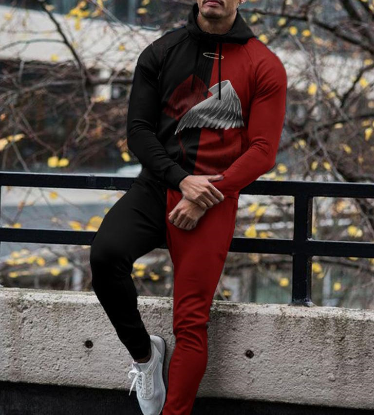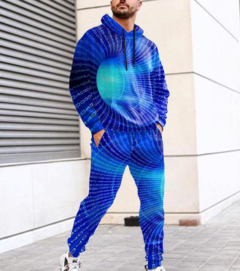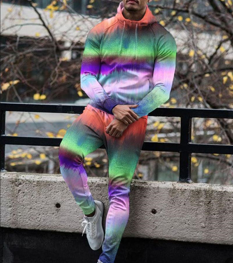 Sports suit men's autumn and winter fashion color blocked casual 3D printed hooded sweatshirt pants two-piece set men's clothing