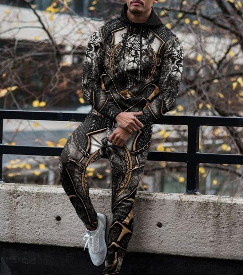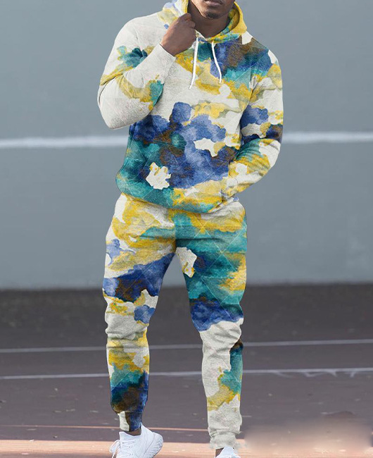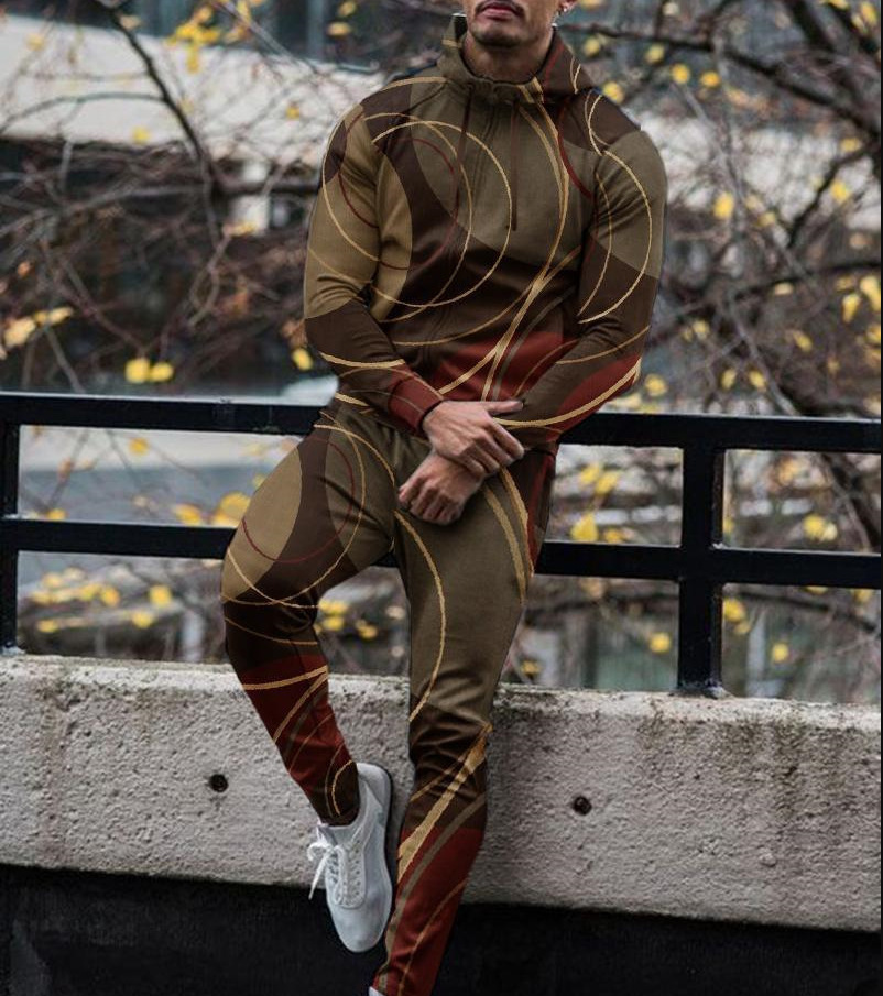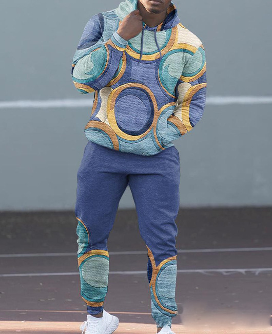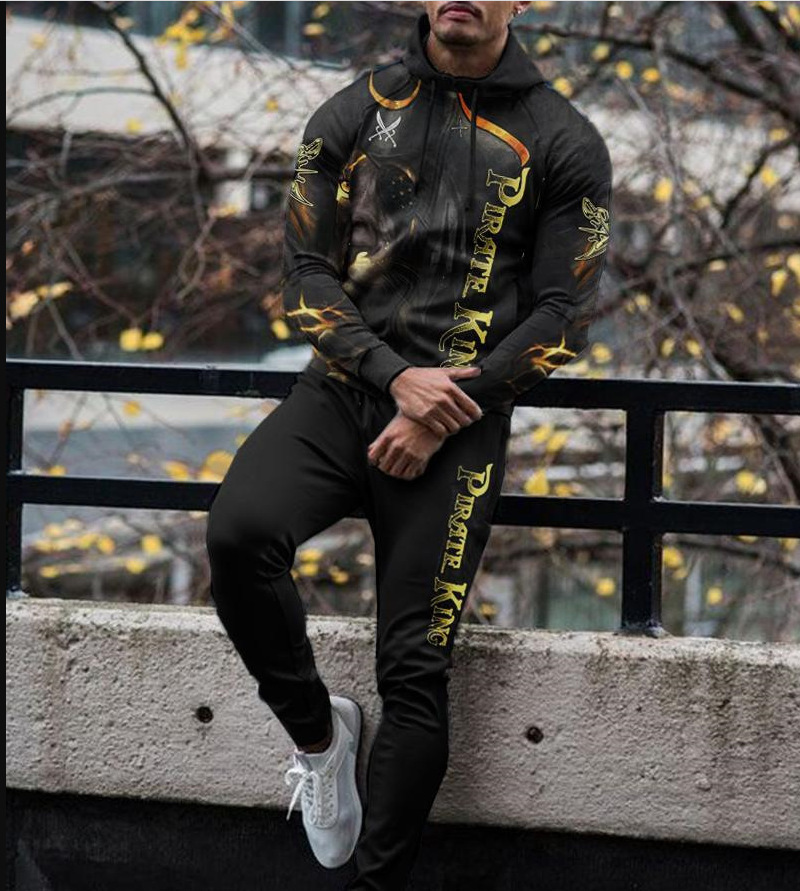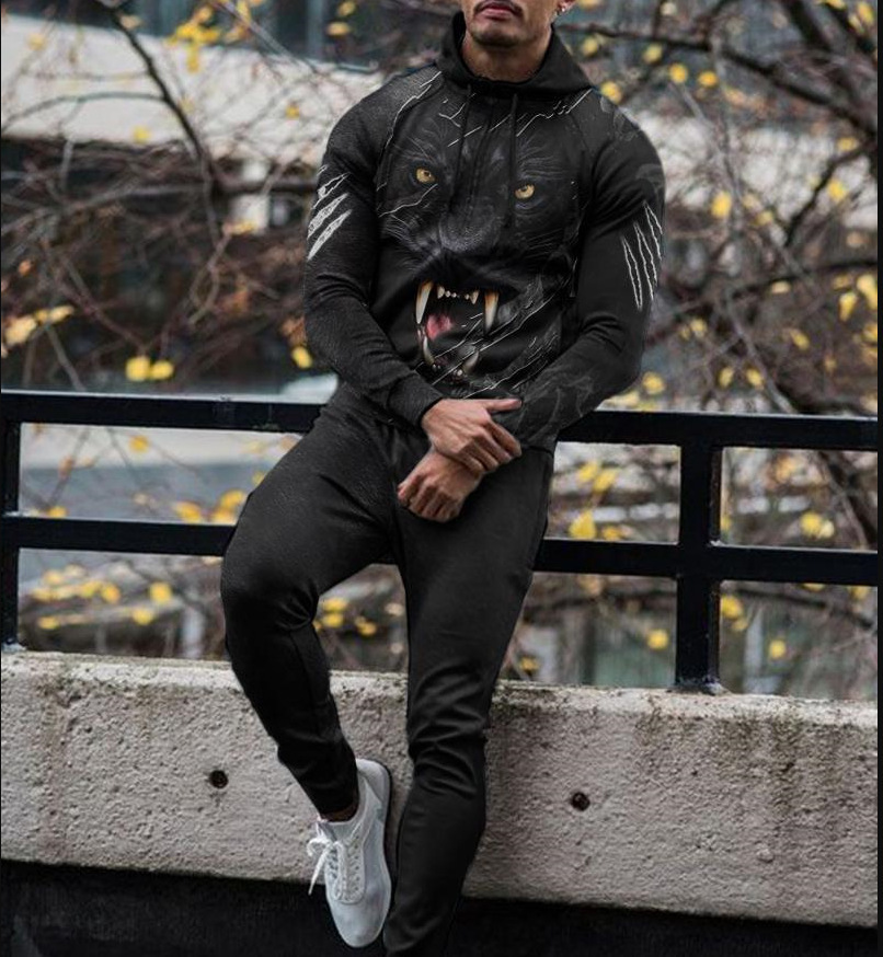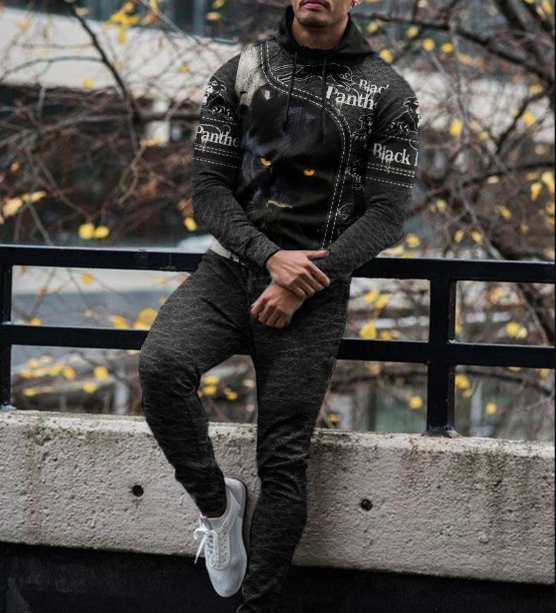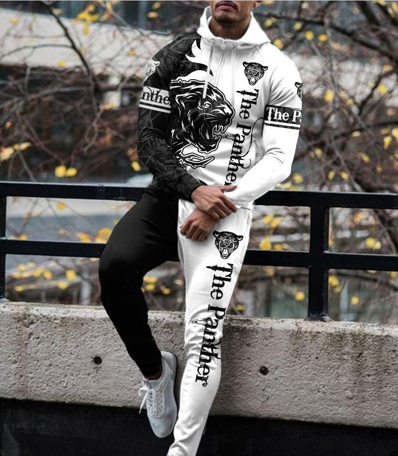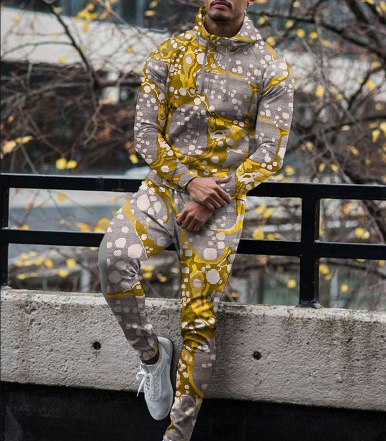 Sports suit men's autumn and winter fashion color blocked casual 3D printed hooded sweatshirt pants two-piece set men's clothing
