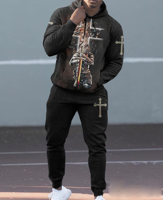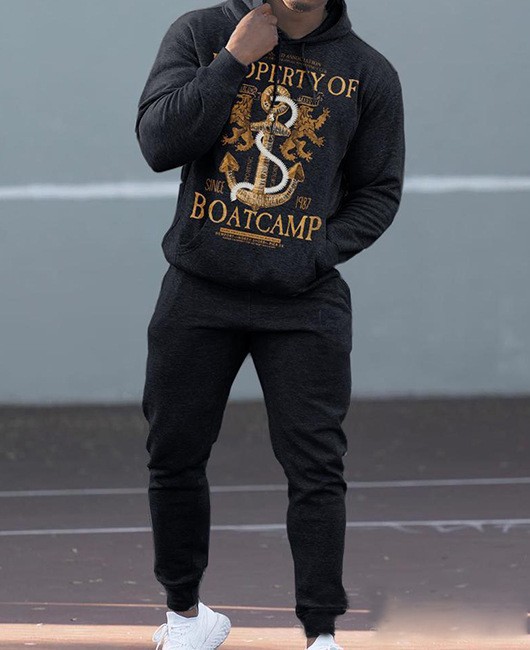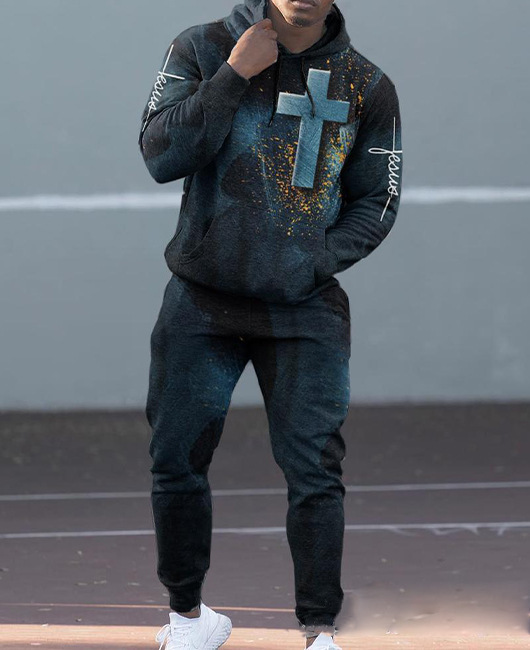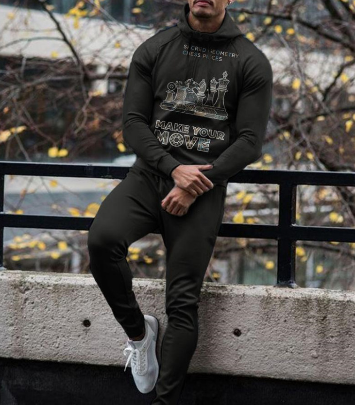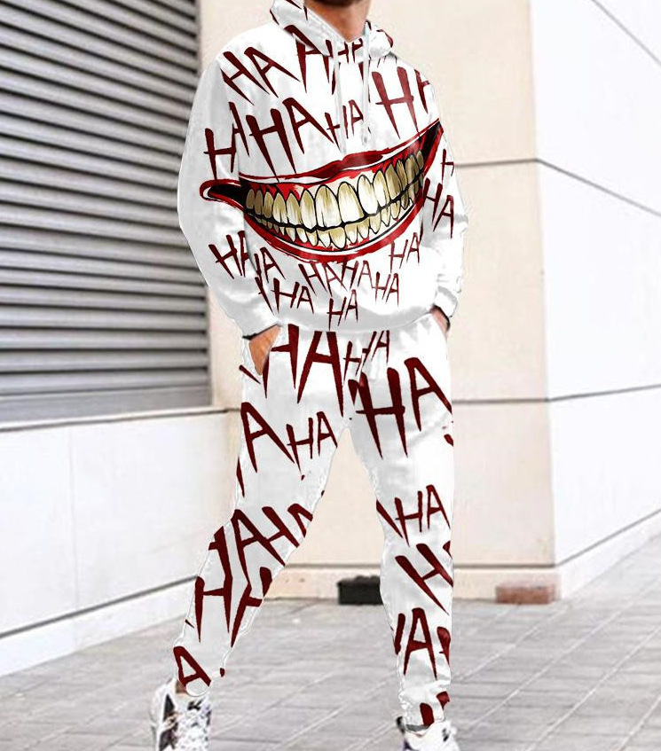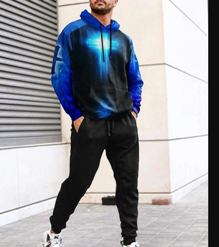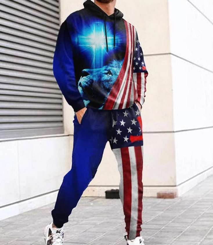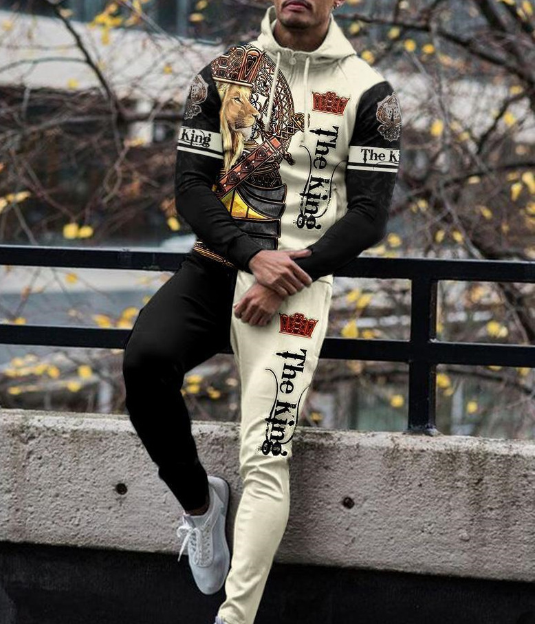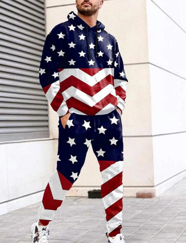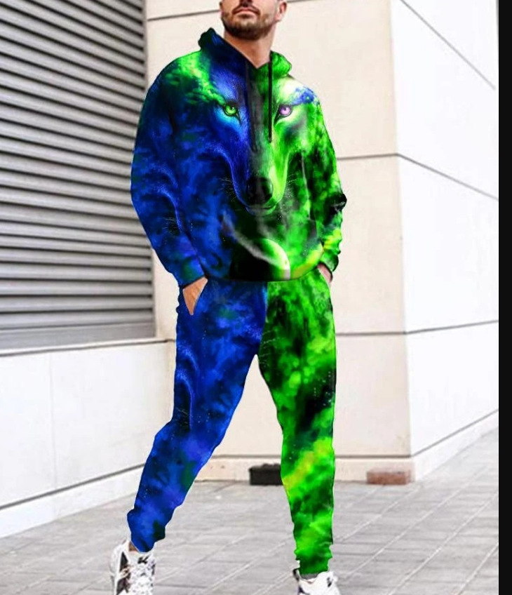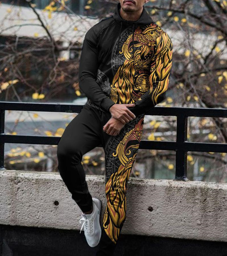 Sports suit men's autumn and winter fashion color blocked casual 3D printed hooded sweatshirt pants two-piece set men's clothing