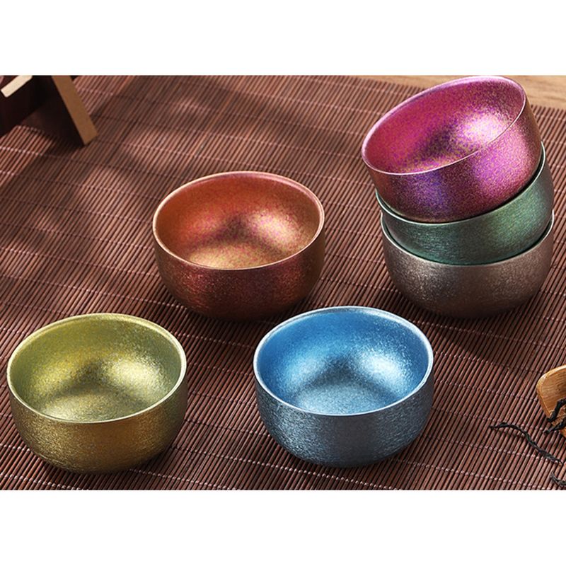 Un set di 6 tazze da tè in titanio puro, tra cui una tazza master a doppio strato Kung Fu, una scatola regalo in cristallo colorato con fiori di ghiaccio,